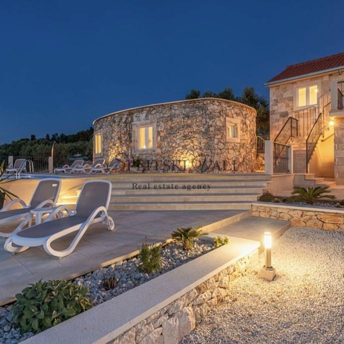 Na idiličnoj lokaciji u blizini Supetra, smještena na prostranoj parceli od čak 8820 m2, nalazi se ova autentična kamena villa koja pruža savršen spoj tradicionalne dalmatinske arhitekture i suvremenog komfora.