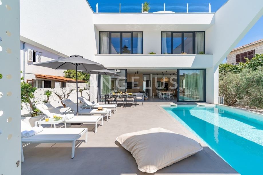 Ova moderna luksuzna vila, izgrađena 2022 g., prostire se na tri etaže ukupne bruto površine od 366 m2, smještena na atraktivnoj parceli od 488 m2 s čije se krovne terase pruža prekrasan pogled na stari grad i more. Šarmatna i neodoljiva nekretnina odiše skladno nijansiranom dozom ljepote i dizajna , gdje se za vrijeme gradnje vodilo računa o svoj potrebnoj privatnosti i komforu, o čemu svjedoči i detaljizirano planiranje i izvedba interijera i okućnice. Ukupna netto površina vile iznosi 240 m2 i sastoji se od otvorenog koncepta kuhinje, blagovaonice i prostranog dnevnog boravka koji su smješteni u prizemlju vile i savršeno su povezani s velikim staklenim stijenkama pune dužine sa vanjskim bazenom. Cijelo prizemlje ima postavljeno podno grijanje i opremljeno je najmodernijom tehnikom i uređajima : TV-om ravnog ekrana, sustavom surround zvuka, WiFi. Iza dnevnog dijela, s nekoliko vanjskih stepenica, dolazi se do sobe s finskom saunom i tušem. Praonica rublja s perilicom i sušilicom rublja nalazi se pokraj. Na međukatu (mezanin) vile nalaze se dvije identične spavaće sobe sa vlastitom kupaonicama i tušem, dok se na prvom katu također nalaze dvije velike sobe s kuponicama i tušem i terasom. Na drugom katu smještena je glavna spavaća soba sa samostojećom kadom,vlastitom kupaonicom s tušem i terasom. Na Roof-top vanjske terase nalazi se ograđeni dnevni boravak okruglog oblika za opuštanje s pogledom na more. Na ovoj razini nalazi se i kućni ured (u potkrovlju) kompletno opremljen.