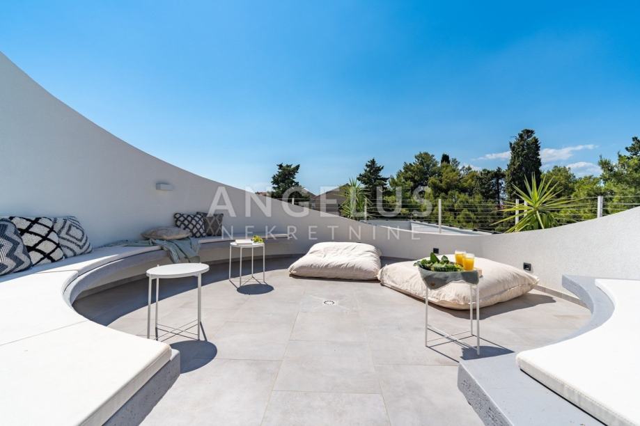 This modern luxury villa, built in 2022, is spread over three floors with a total gross area of 366 m2, located on an attractive plot of 488 m2, the roof terrace of which offers a wonderful view of the old town and the sea. The charming and irresistible real estate exudes a harmoniously nuanced dose of beauty and design, where during the construction, all necessary privacy and comfort were taken care of, as evidenced by the detailed planning and execution of the interior and garden. The total net area of the villa is 240 m2 and consists of an open concept kitchen, dining room and spacious living room which are located on the ground floor of the villa and are perfectly connected with the large full-length glass walls to the outdoor pool. The entire ground floor has underfloor heating and is equipped with the most modern technology and devices: flat screen TV, surround sound system, WiFi. Behind the living room, with several external stairs, you can reach the room with Finnish sauna and shower. A laundry room with a washing machine and dryer is located next door. On the intermediate floor (mezzanine) of the villa there are two identical bedrooms with their own bathrooms and showers, while on the first floor there are also two large rooms with kitchenettes and showers and a terrace. On the second floor, there is a master bedroom with a free-standing bathtub, a private bathroom with a shower and a terrace. On the Roof-top outdoor terrace there is a fenced living room with a round shape for relaxing with a view of the sea. On this level there is also a fully equipped home office (in the attic).