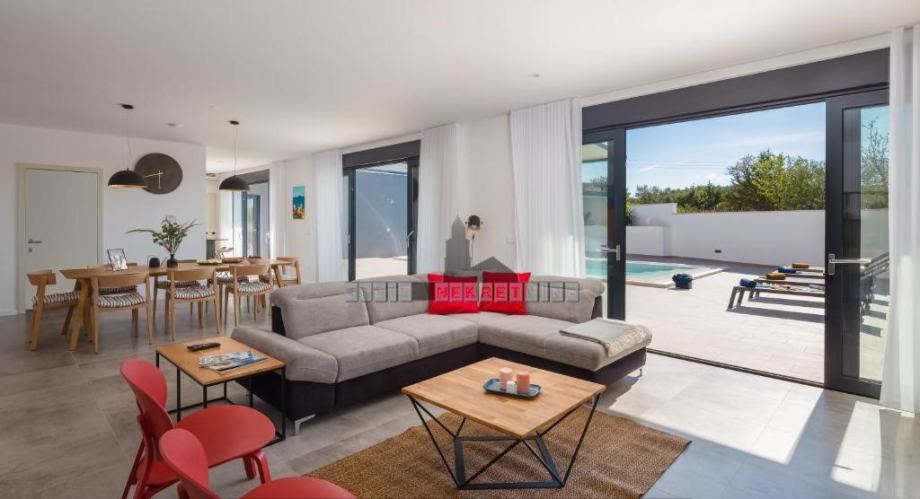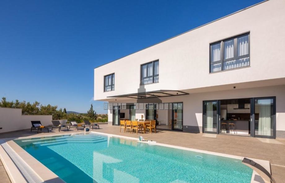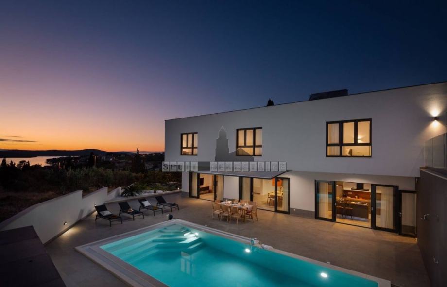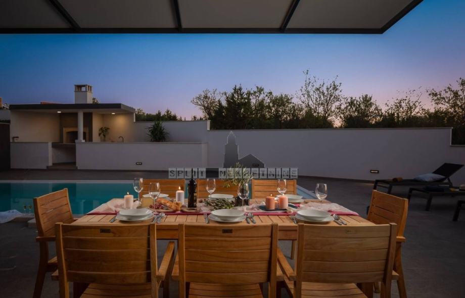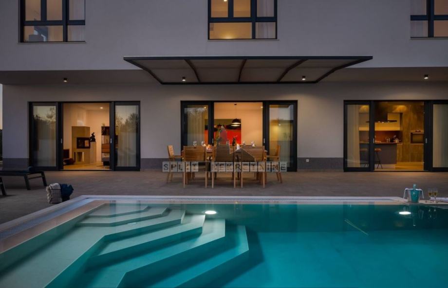 Vanjski dio prizemlja odijeljen je staklenim stijenkama od dnevnog prostora. Vani se nalazi natkrivena terasa, bazen (9 x 4,2), prostor za sunčanje, vanjska ljetna kuhinja s kaminom te veliki blagovaonski stol.