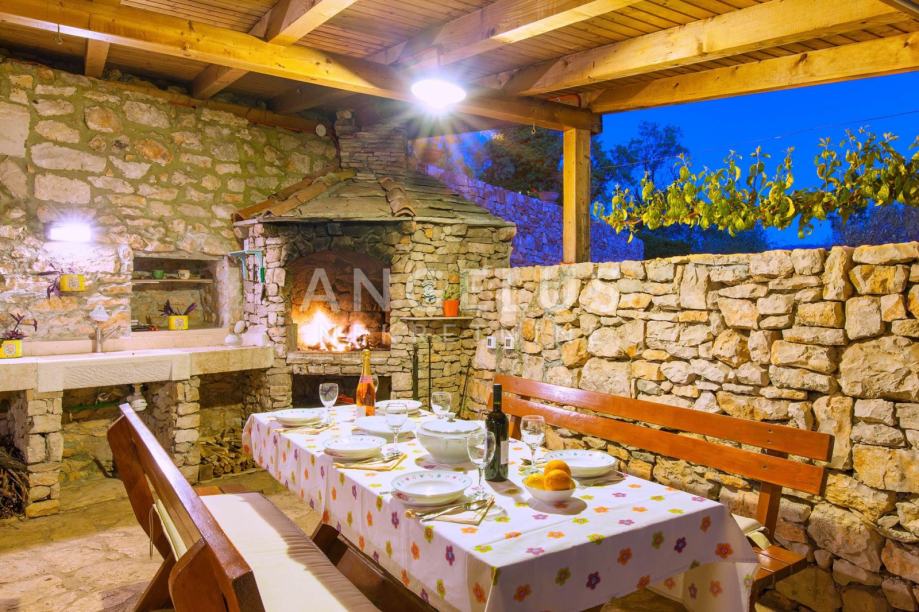 Kuća je raspoređena na tri etaže i osmišljena kao skladna cjelina u kojoj se tradicionalna arhitektura susreće sa suvremenom udobnošću. Prizemlje čini otvoreni životni prostor u kojem se kuhinja, blagovaonica i dnevni boravak prirodno nadovezuju jedan na drugi. Središnje mjesto zauzima kamin koji prostoru daje toplinu i intimnu atmosferu, čineći boravak ugodnim tijekom cijele godine. Iz dnevnog dijela izlazi se na kamenu terasu koja postaje produžetak interijera – mjesto gdje se jutra započinju uz kavu, a večeri završavaju uz čašu vina pod otvorenim nebom.