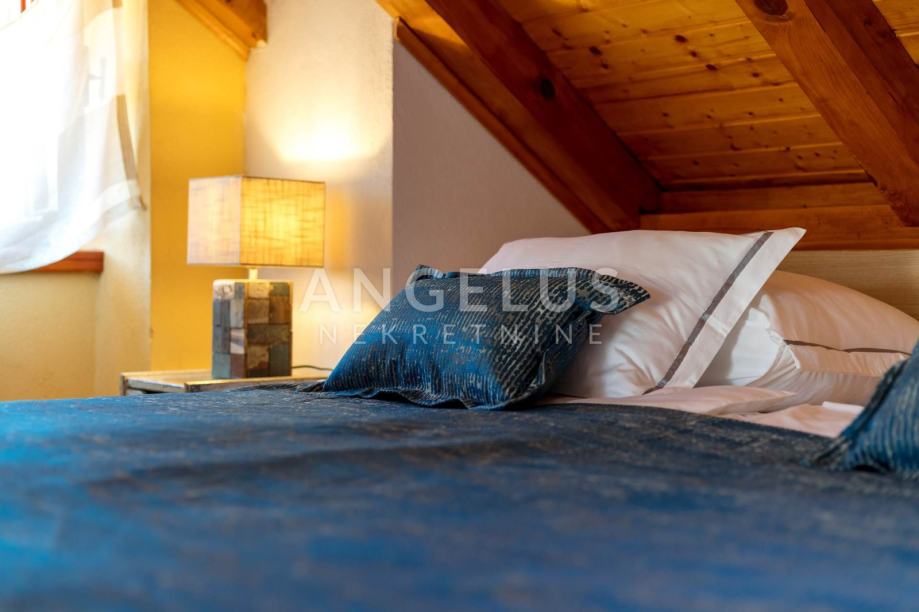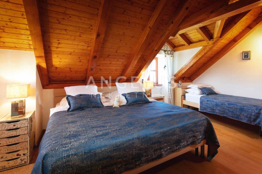 Na prvom katu smještene su dvije spavaće sobe i kupaonica. Potkrovlje skriva treću spavaću sobu, kupaonicu i izlaz na prostranu terasu, s koje se pruža pogled na slikovitu jezgru mjesta i okolne krovove. To je prostor stvoren za mir, tišinu i osjećaj izdvojenosti, iako se nalazite u samom centru.