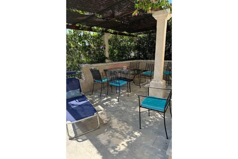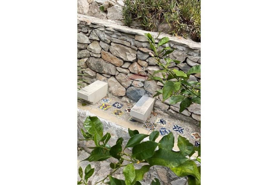 Ispod kuće je terasa sa zidanim roštiljem i pergolom, a odvojeni vrt je prepun mediteranskog bilja.