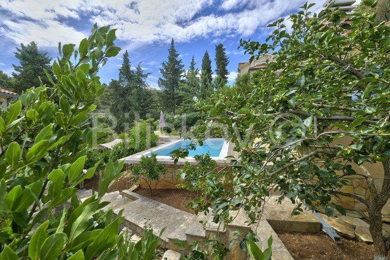 Brač, Splitska, 2 samostojeće kuće i bazen na kultiviranoj okućnici od 1000 m2 u centralnom dijelu mjesta, sa pogledom na more.