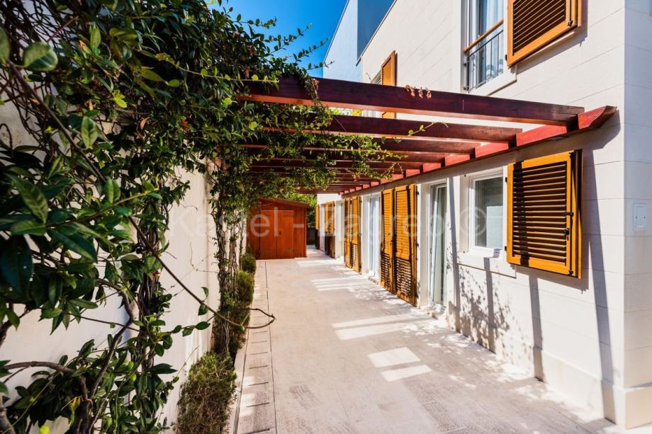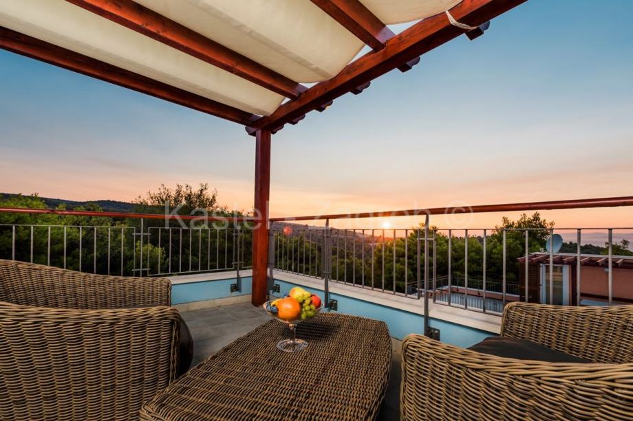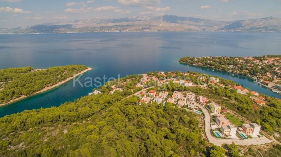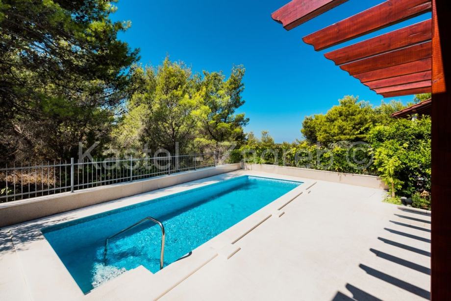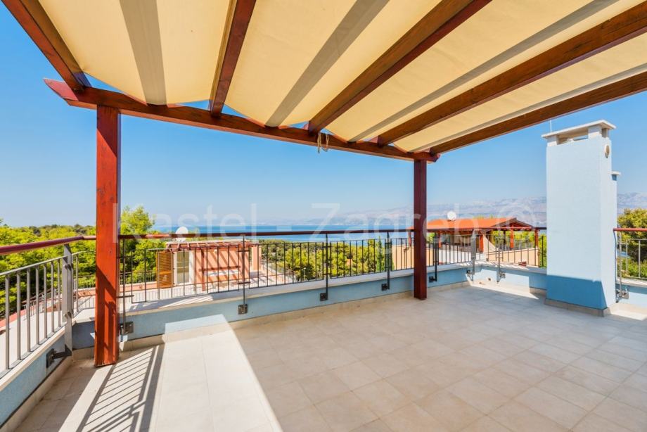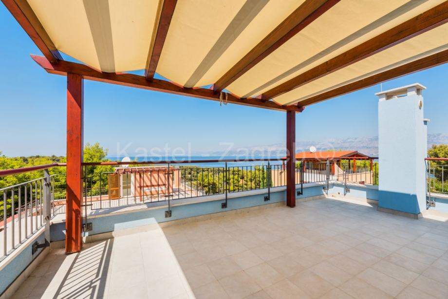 Vila se nalazi na parceli od cca 420 m² na fantastičnoj lokaciji u Splitskoj na hrvatskom otoku Braču. Kvalitetna oprema, kao i moderan i otvoren dizajn prostora naglašavaju osjećaj luksuza. Vila Vam nudi stambeni prostor od cca 227 m² koji se prostire na dvije etaže s ukupno četiri prostrane sobe. U prizemlju vile nalazi se prostrani dnevni boravak i blagovaonica s kaminom te otvorena i potpuno opremljena kuhinja. Odavde također imate pristup stilski uređenoj terasi i bazenu. Na gornjoj razini vile nalaze se tri udobne spavaće sobe, svaka s modernom vlastitom kupaonicom. Nadalje, na raspolaganju su i dva balkona na kojima možete uživati na suncu i opuštati se. Vrhunac vile je veličanstvena krovna terasa s koje se pruža prekrasan pogled od 360 stupnjeva na more i krajolik Splitske. Osim toga, krovna terasa je djelomično natkrivena drvenom pergolom, tako da i za kišnih dana možete uživati u svježem morskom zraku hrvatskog otoka. U uređenom vanjskom prostoru, osim prekrasnog bazena s vanjskim tušem, imate i prostranu terasu s natkrivenom blagovaonom i masivnim kamenim roštiljem. Svoje automobile možete udobno parkirati na pripadajuća dva vanjska parkirna mjesta. Ostale značajne karakteristike vile su praktični ugradbeni ormari, klimatizacija u svim sobama i podno grijanje u kupaonici.