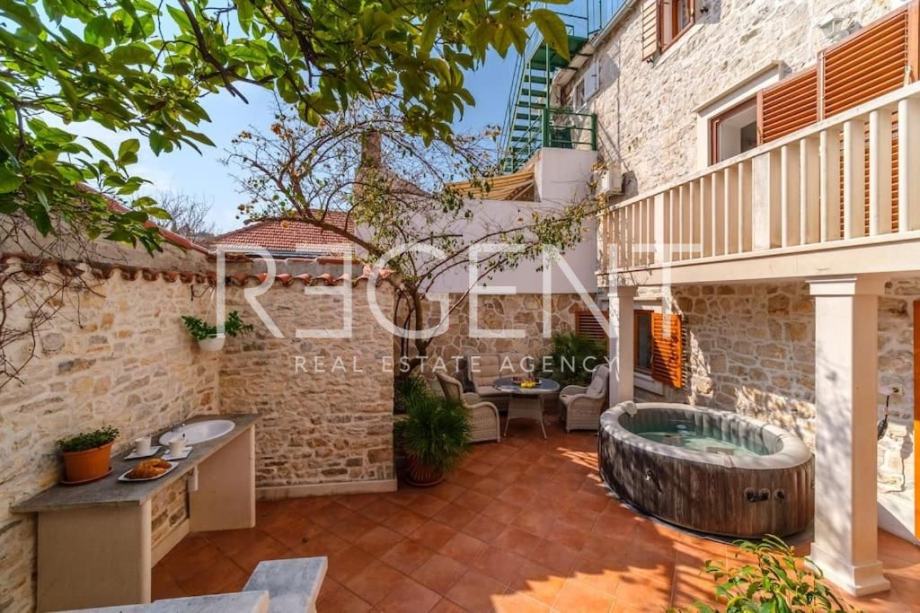 U mirnom dijelu Sutivana, samo 200 metara od plaže, nalazi se ova prostrana i potpuno opremljena kuća idealna za odmor, obiteljski život ili turistički najam. Smještena u neposrednoj blizini plaža Majakovac i Grgina, nudi savršen spoj mediteranskog šarma i funkcionalnosti.Kuća je potpuno renovirana i prostire se na tri etaže s ukupno 180 m² stambene površine. U prizemlju se nalazi kuhinja, dnevni boravak, jedna spavaća soba i kupaonica. Na prvom katu smještene su dvije spavaće sobe i dvije kupaonice, dok drugi kat nudi dodatnu kuhinju, dnevni boravak, još jednu spavaću sobu, kupaonicu i izlaz na prostranu terasu površine 25 m².Uz kuću dolazi i privatni dvor veličine 30 m², idealan za opuštanje u hladu maslina ili uživanje u toplim večerima. Prodaje se kompletno namještena, što ovu nekretninu čini odmah spremnom za useljenje ili turistički najam.Okućnica uključuje privatni vrt, vanjski blagovaonski prostor te privatni parking. Zahvaljujući lokaciji, sadržajima i uređenju, ova kuća predstavlja izvrsnu priliku za one koji traže mirnu oazu nadomak mora, ali i odličnu investiciju za turistički najam.Za sve dodatne informacije kao i dogovor o razgledavanju, slobodno nas kontaktirajte!Za više informacija, kontaktirajte našeg agenta na brojeve telefona: