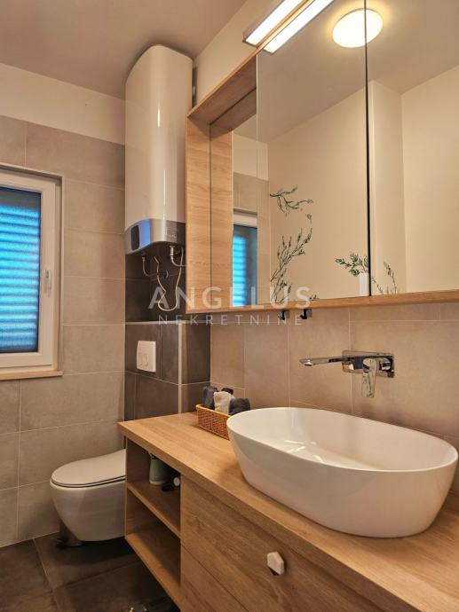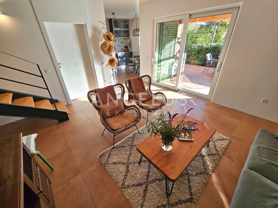 Gostinjska kuća je modernog, otvorenog koncepta, ukupne površine 42 m2 koja se sastoji od kuhinje, blagovaonice i dnevnog boravka, a ovaj prostor je zanimljivim drvenim gredama odvojen od spavaćeg dijela i kupaonice.