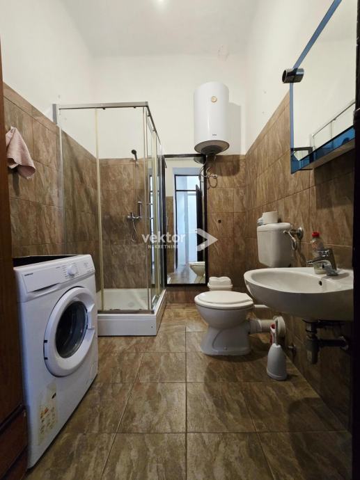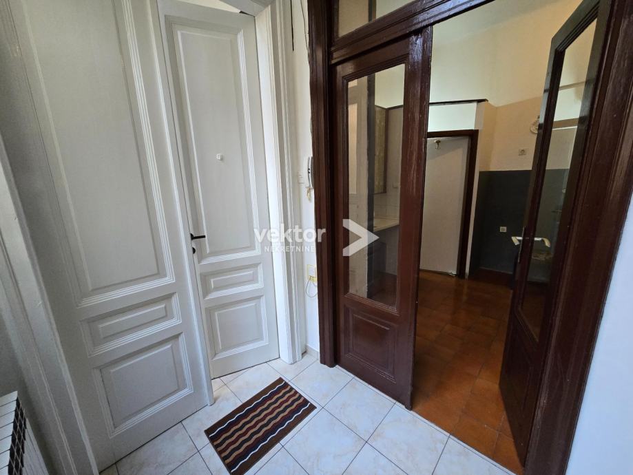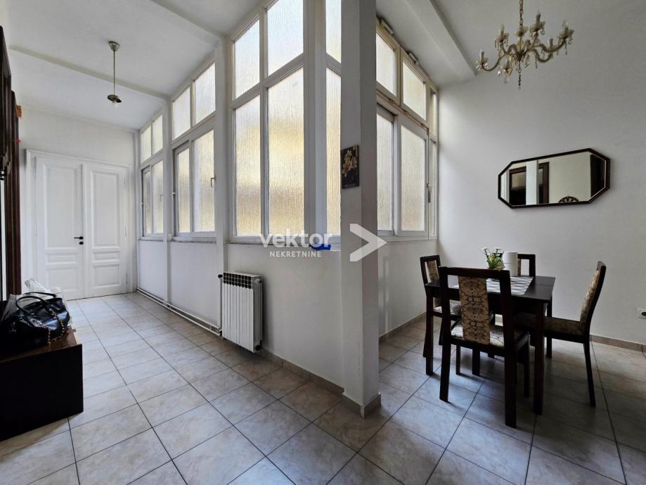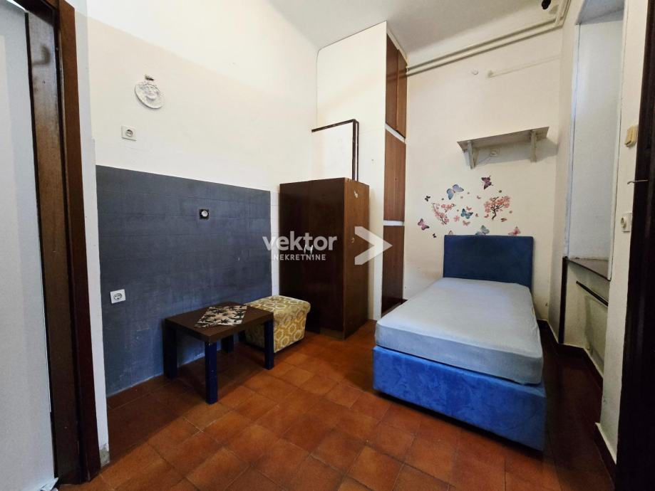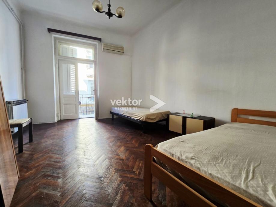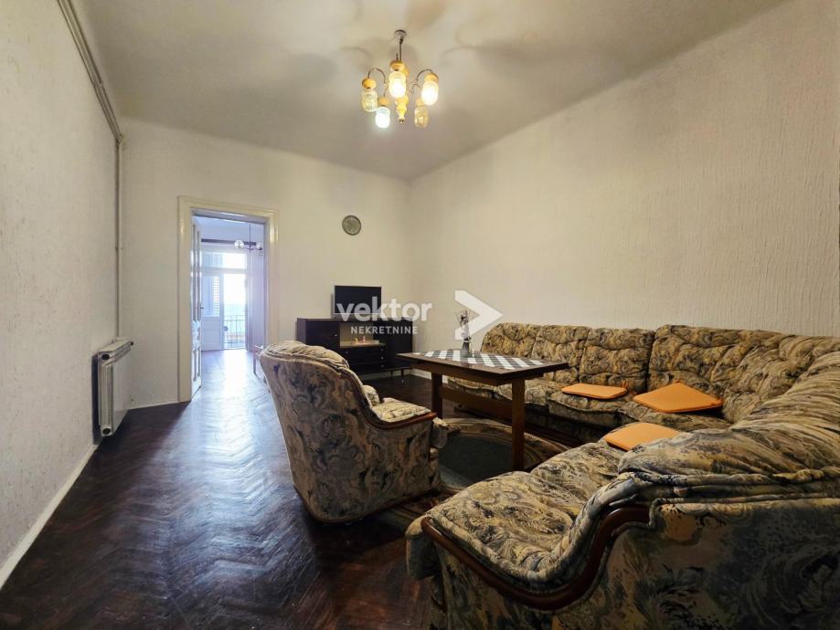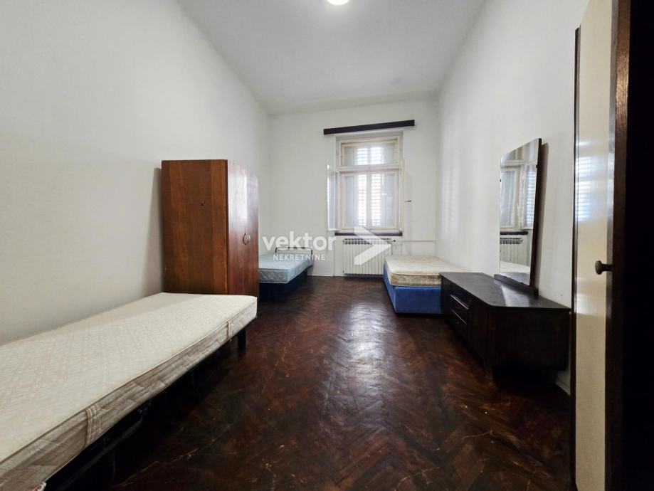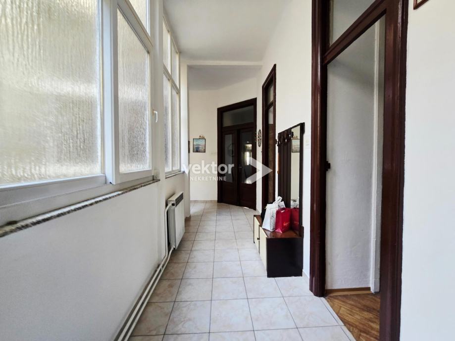 Stan površine 120m2 se nalazi na 2.katu, ima 4 velike sobe, manju kuhinju i kupaonu, a iz zajedničkog hodnika ulazi se u manju garsonijericu s kupaonom.