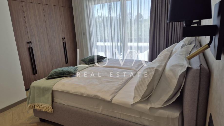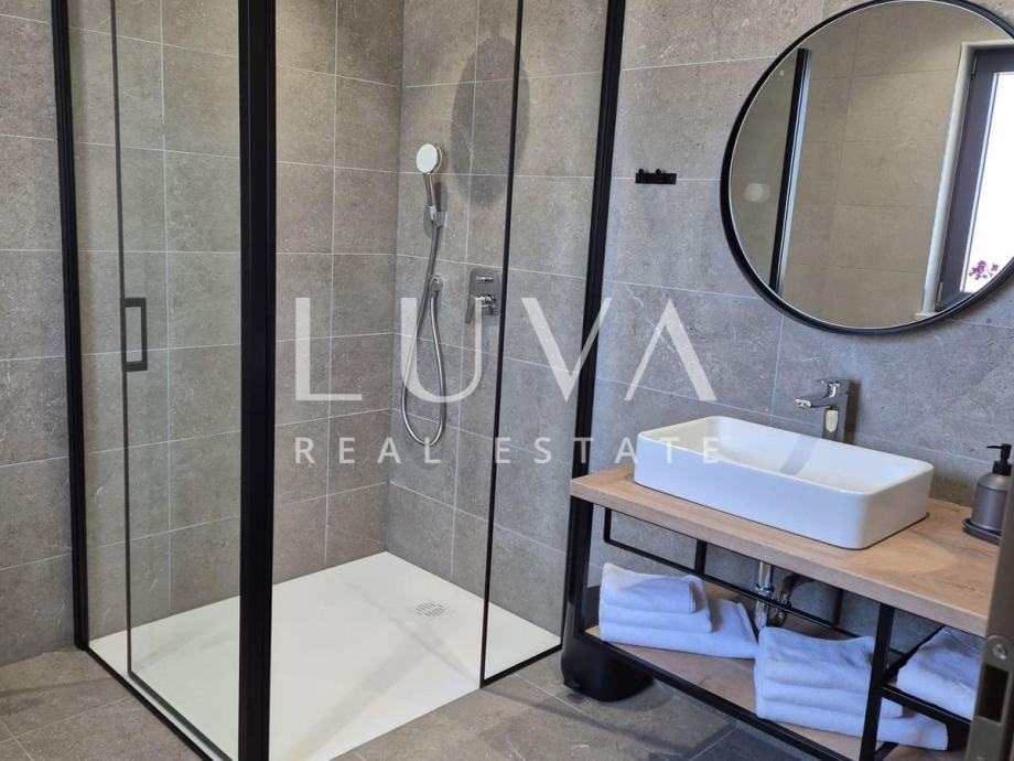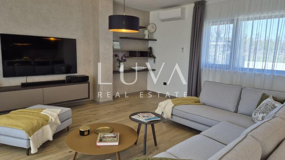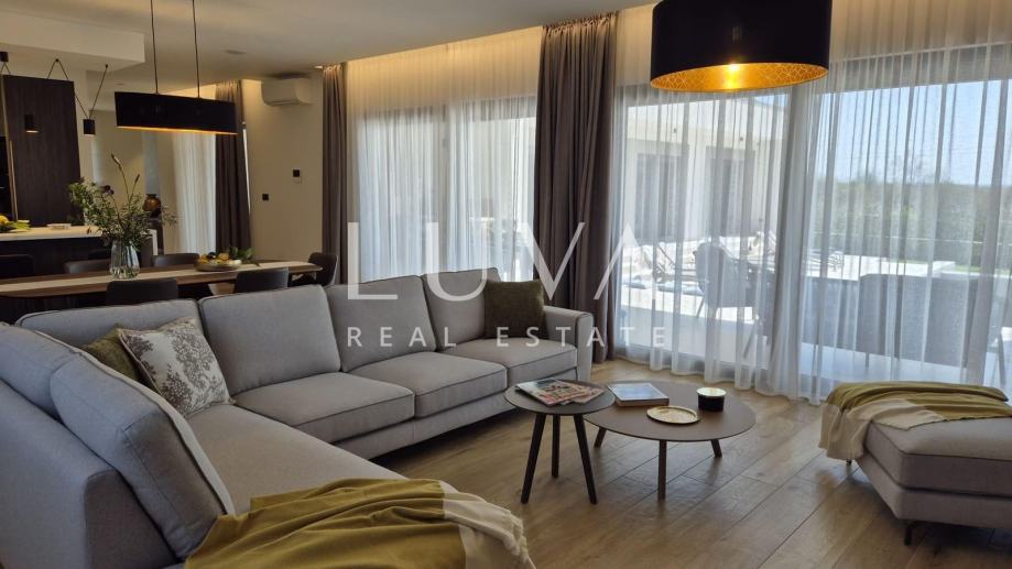 Vila je izgrađena 2024. godine i opremljena suvremenim sustavima – podnim grijanjem putem dizalice topline (Daikin), klimatizacijom, električnim roletama, videonadzorom, alarmnim sustavom i modernim namještajem (djelomično uključenim u cijenu, s mogućnošću dogovora za dodatnu opremu). Fasada kombinira kamen, izolaciju i opeku, dok je krov izveden kao kosi s pokrovom od crijepa. Unutrašnje površine oplemenjene su visokokvalitetnim keramičkim pločicama, a okućnica uključuje automatsko navodnjavanje, vanjsku rasvjetu i četiri parkirna mjesta. Cijelo imanje površine 1.184 m² ograđeno je i opremljeno motoriziranim ulazom.
