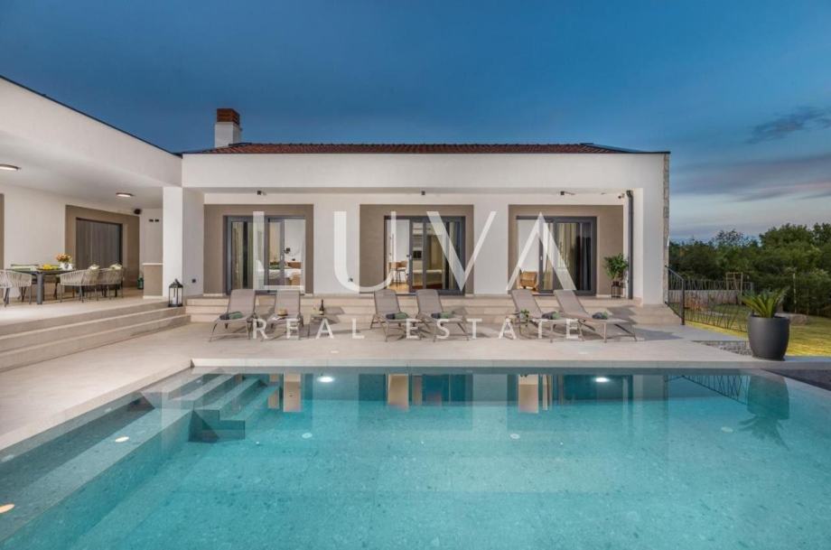 U mirnom istarskom krajoliku, svega 11 kilometara od mora i slikovitog Rovinja, smještena je ova moderna vila koja spaja suvremeni luksuz s elementima tradicionalne arhitekture. Inspirirana lokalnim graditeljstvom, kuća se ističe kamenim oblogama, dizajnerskim detaljima i velikom natkrivenom terasom s ljetnom kuhinjom, stvarajući skladnu cjelinu idealnu za opuštanje i boravak tijekom cijele godine. Preljevni bazen površine 40 m² smješten je na sunčalištu orijentiranom prema jugu i zapadu, savršeno uklopljen u brižno njegovan okoliš ispunjen raznovrsnom vegetacijom koja će u budućnosti pružati prirodnu hladovinu i intimu.