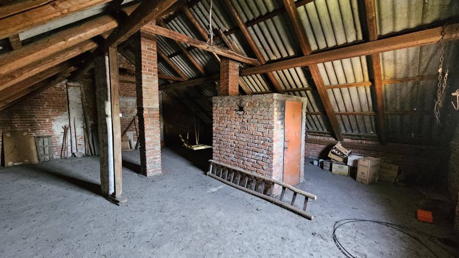 Tavan: otvoreni prostor pod kosim dvostrešnim krovom, zidana pušnica za sušenje/dimljenje mesa.