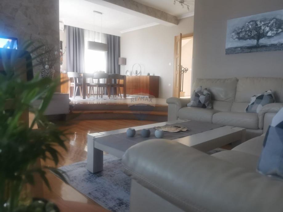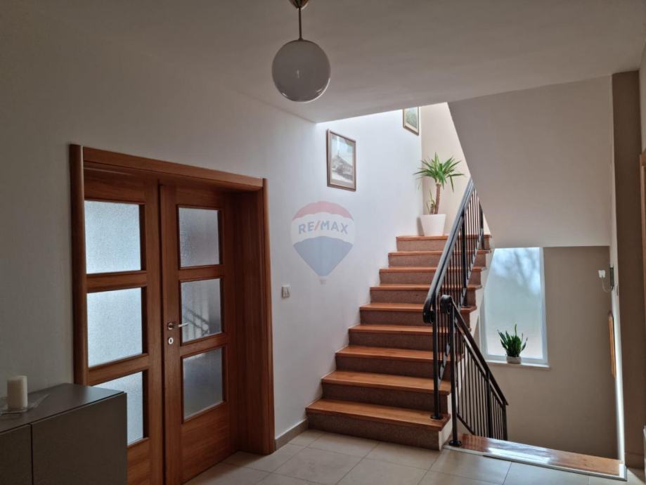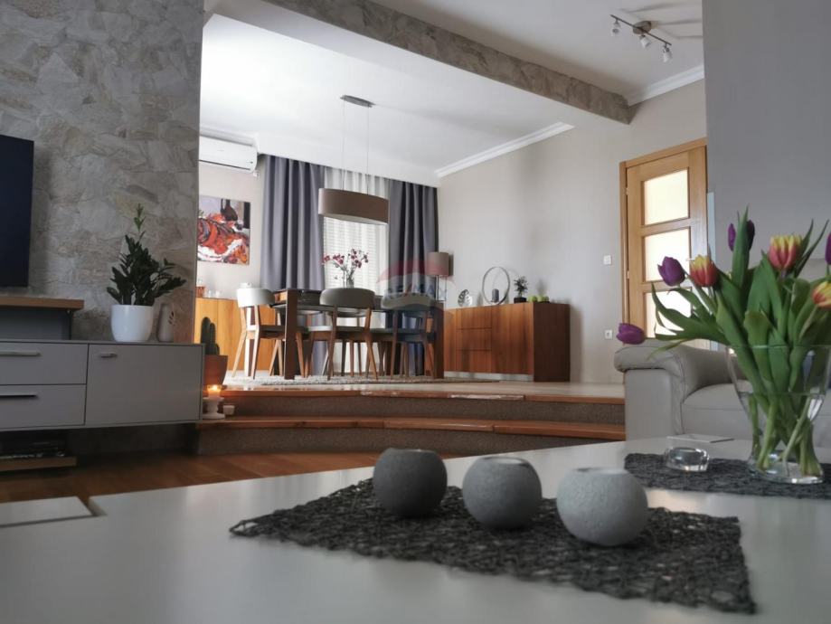 Bregi - Ova moderna obiteljska kuća sastoji se od tri etaže /S+P+1/ ukupne stambene površine od 230 m2 te pripadajuće okućnice od 800 m2.