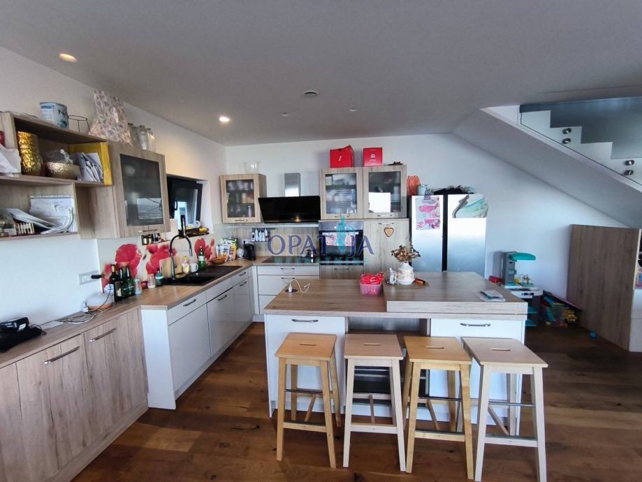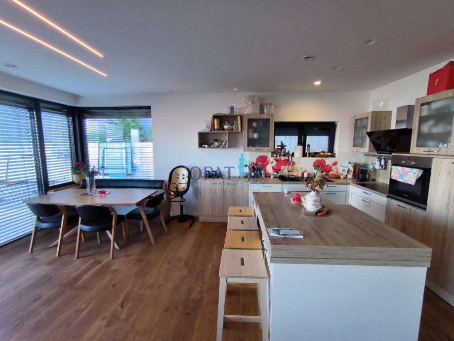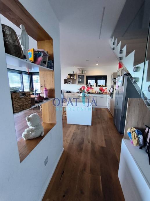 Prekrasna moderna, niskoenergetska, samostojeća kuća koja se proteže na dvije etaže od 180 m2. U prizemlju kuće je open space prostor u kojem se nalaze kuhinja, blagovaona, dnevni boravak i kupaona. Stepenicama se penje na gornju etažu gdje su smještene tri spavaće sobe i dvije kupaone. S donje etaže izlazi se na prekrasnu terasu i okućnicu gdje se nalazi bazen, lounge prostor te natkriveni prostor za roštilj i druženje. Grijanje je na dizalicu topline, ugrađen je vrlo moderni ventilacijski sustav. Kuća je vrlo dobro izolacijski napravljena te nema nikakvih problema s prokišnjavanjem i vlagom. Dodatni luksuz ove nekretnine je i bazen koji ima masažni dio, protustrujnu mogućnost te grijanje. Pogled na cijeli Kvarnerski zaljev je nešto u čemu ćete svakodnevno moći uživati ukoliko se odlučite za ovu nekretninu.