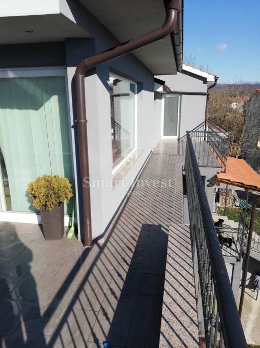 Stan ima prekrasnu veliku terasu s otvorenim pogledom na zelenilo. Na korištenje su mu dva natkrivena parkirna mjesta na okućnici kuće.