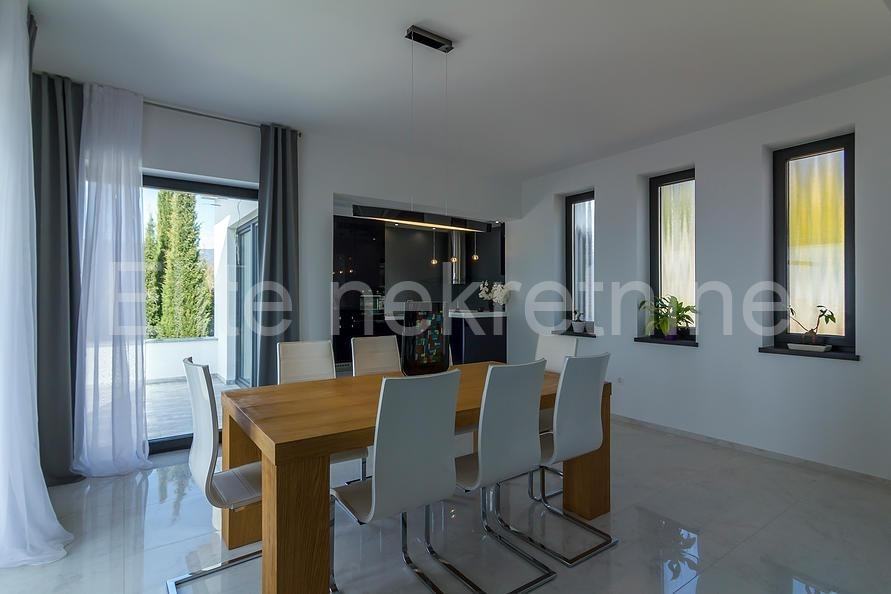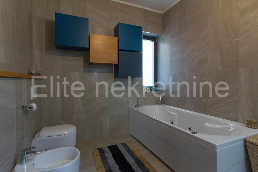 Iznajmljuje se luksuzno i moderno uređena etaža u villi građena visokokvalitetnim materijalima, u tipično mediteranskom ugođaju. Iznimna nekretnina na našem tržištu, a sastoji se od dvije spavaće sobe, kuhinje s blagovaonicom, dvije kupanice te dnevnim boravkom. Ova etaža ima na korištnje bazen, privatnim parking te okućnica s uređenom hortikulturom.