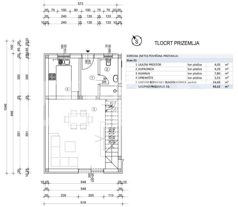 Prizemlje: ulazni prostor (4,05 m2), kupaonica 1 (4,29 m2) i dnevni boravak s blagavaonicom (24,68 m2), kuhinja ( 7,80 m2 ) i spremište ( 2,33 m2 ) ukupne prodajne površine 43,15 m2.