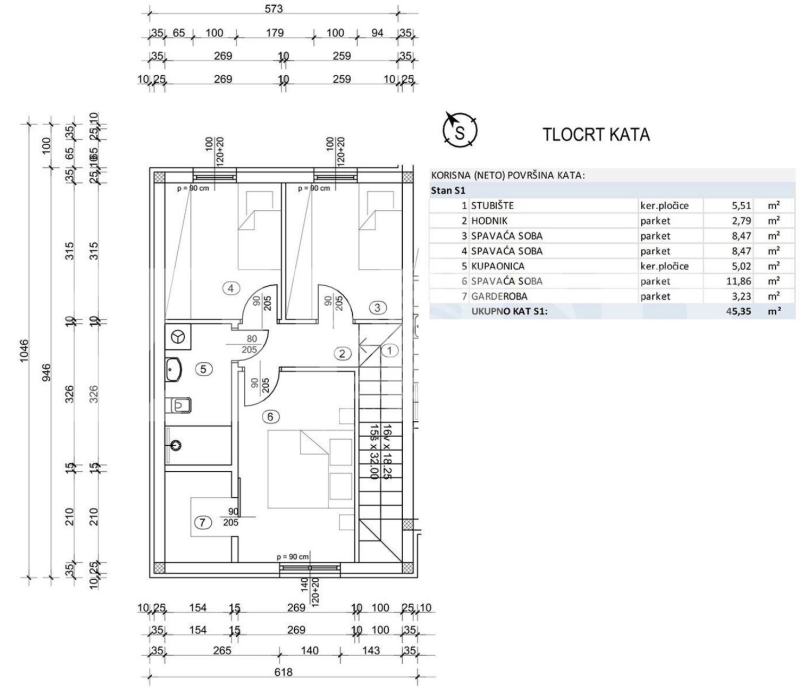 Kat: stubište (5,51m2), hodnik ( 2,79 m2), spavaća soba 1 ( 8,47 m2), spavaća soba 2 ( 8,47 m2), kupaonica ( 5,02 m2), spavaća soba 3 (11,86 m2), garderoba ( 3,23 m2 ), ukupne prodajne površine 45,35 m2.