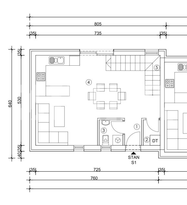 Prizemlja: ulazni prostor (1,60m2), spremište (1,50m2), wc (2,10m2), dnevni boravak sa kuhinjom i blagovaonicom (28,86m2), stubište (4,17m2), ukupne površine 38,23 m2.