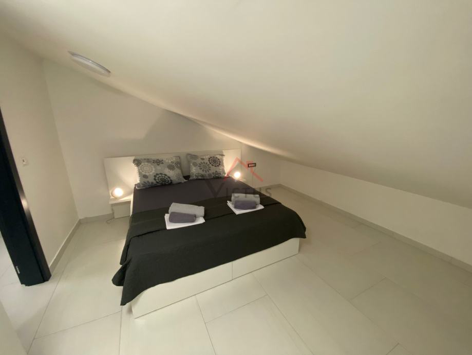 Sastoji se od hodnika, prostranog dnevnog boravka s kuhinjom i blagovaonicom, dvije spavaće sobe, dvije kupaonice i velike krovne terase, s predivnim otvorenim pogledom na more i Vinodolsku dolinu, te dovoljno prostora za druženje i roštilj. Stan je opremljen podnim grijanjem i klima uređajima, te električnim roletama.