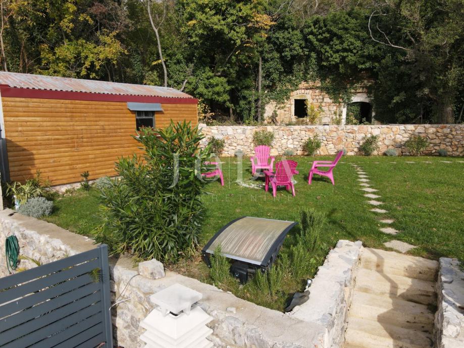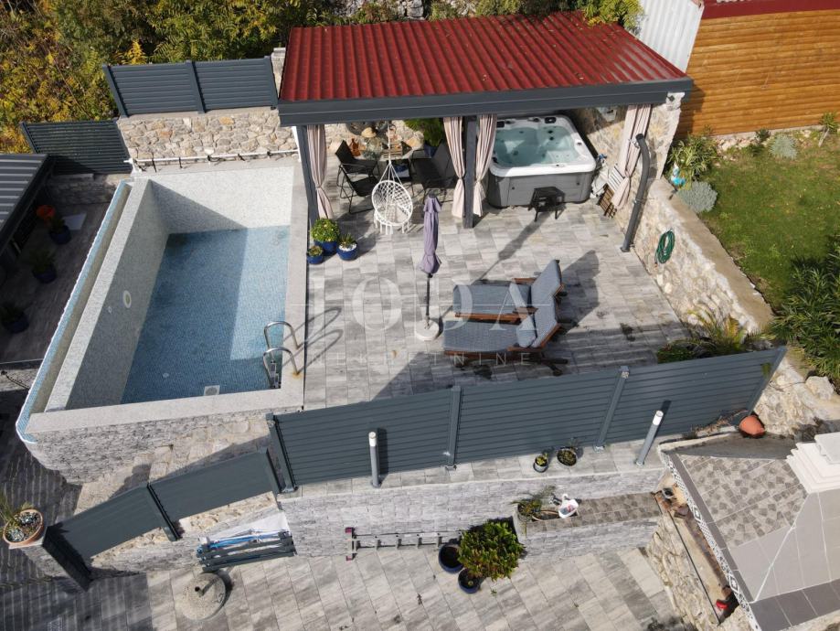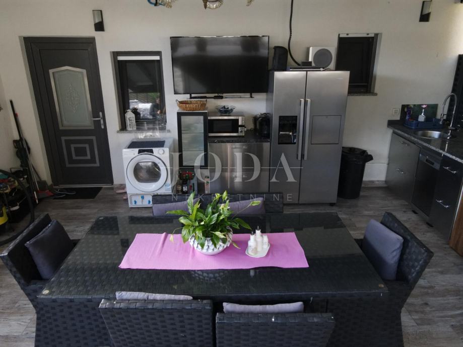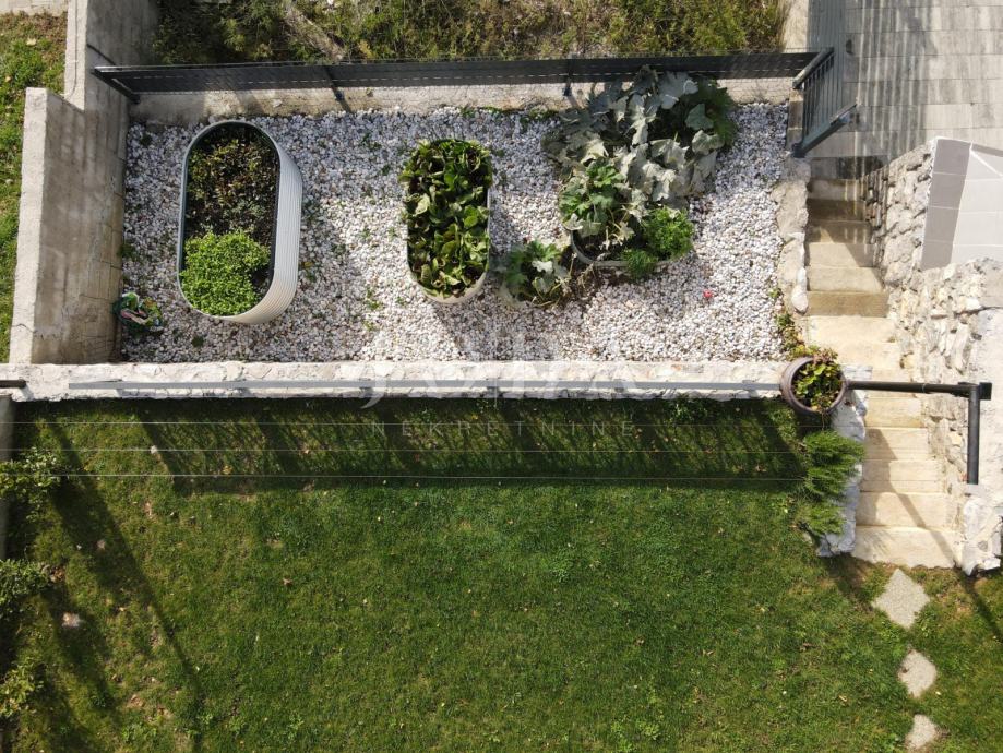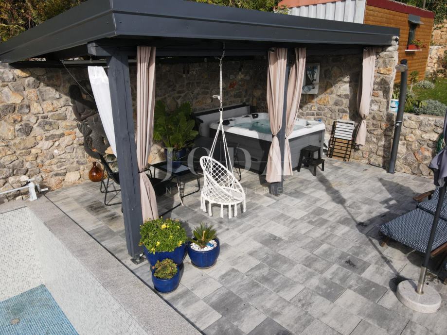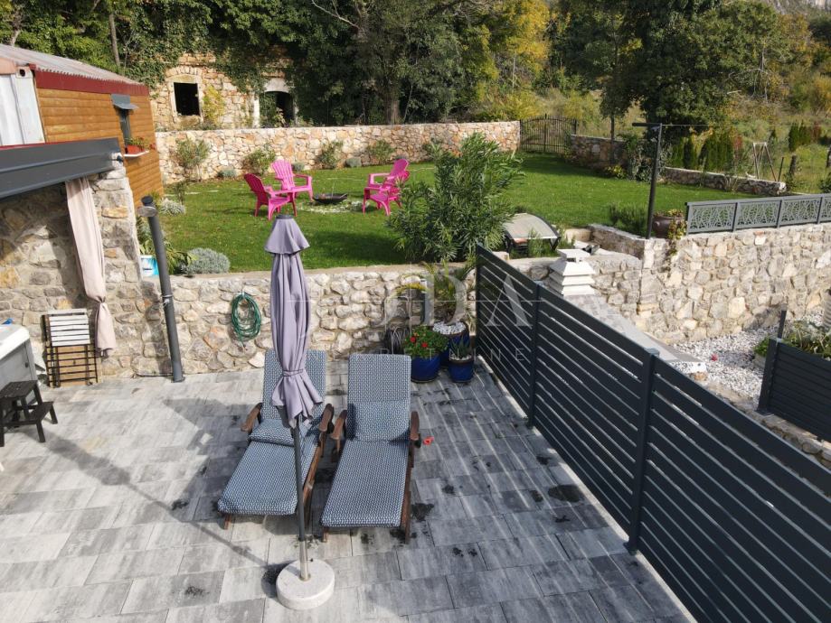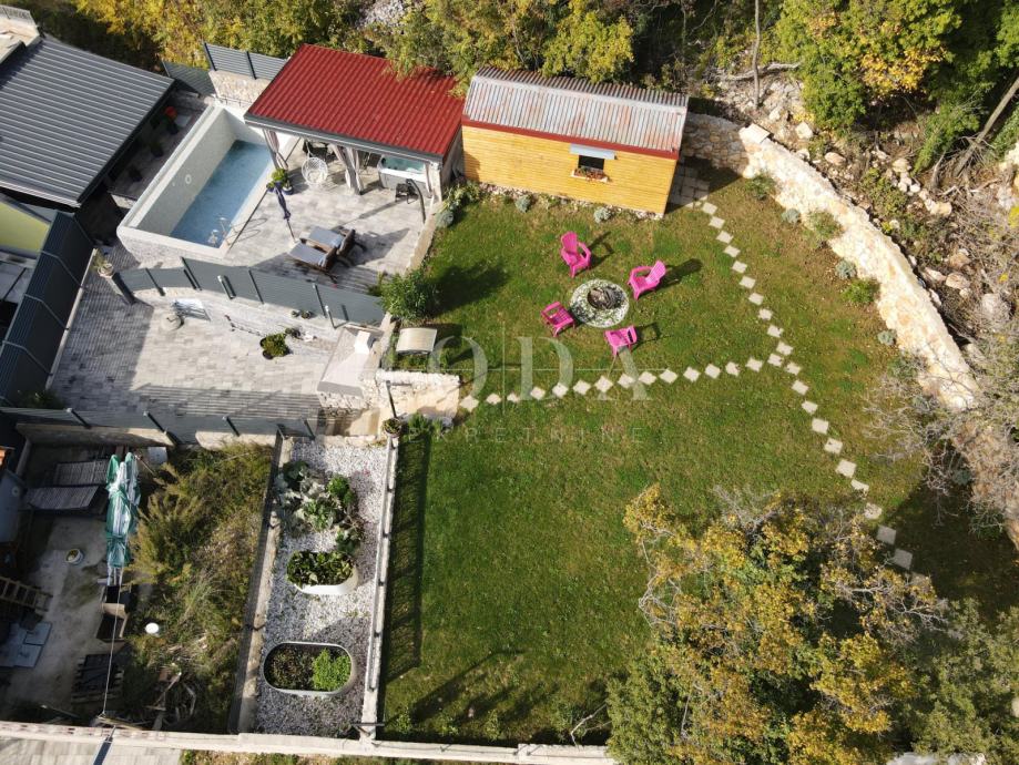 Na kuću se nadovezuje vanjsi prostora za druženje,sa ljetnom kuhinjom,te roštilj,bazen a na samom vrhu kaskadno formirane okućnice je lijepi travnjak sa vrtnom kućicom.