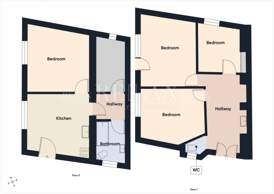 Kuća se prostire na dvije etaže. U prizemlju se nalazi kuhinja s blagovaonicom, jedna soba koja trenutno služi kao spavaća soba, kupaonica, ostava te dodatni dio uređen kao ljetna kuhinja. Kat kuće odlikuju viši stropovi koji prostoru daju dodatnu prozračnost. Na katu su smješteni hodnik, odvojeni WC, dvije manje spavaće sobe te jedna veća spavaća soba s izlazom na balkon.