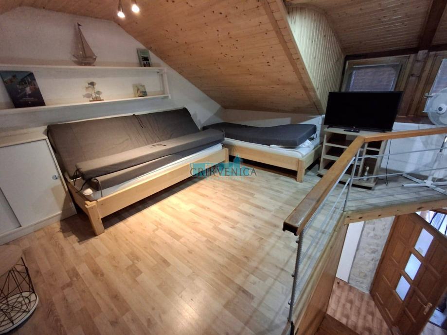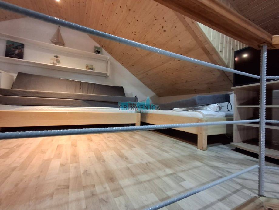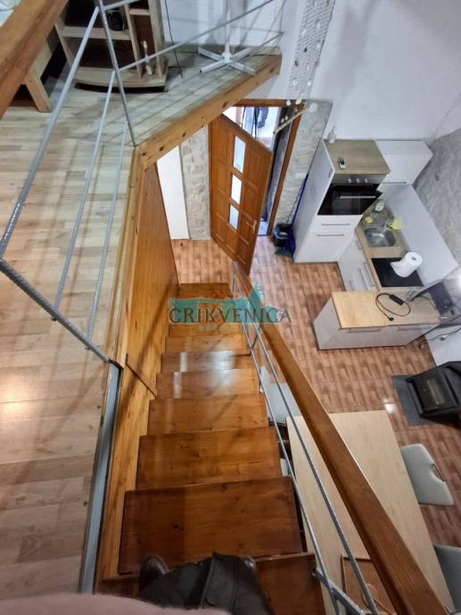 U prizemlju se nalazi jedna spavaća soba i predprostor sa drvenim unutarnjim stepeništem koje vodi na prvi kat na kojem je smještena kuhinja sa blagovaonicom, kupaonica te još jedna spavaća soba. Potkrovlje je osmišljeno kao galerija u koju se iz kuhinje i blagovaonice dolazi drvenim stepeništem. Prizemlje i 1. kat imaju izlaz u dvorište odnosno na natkrivenu terasu veličine 20 m2. U donjem dijelu dvorišta nalazi se roštilj i prostor za druženje.