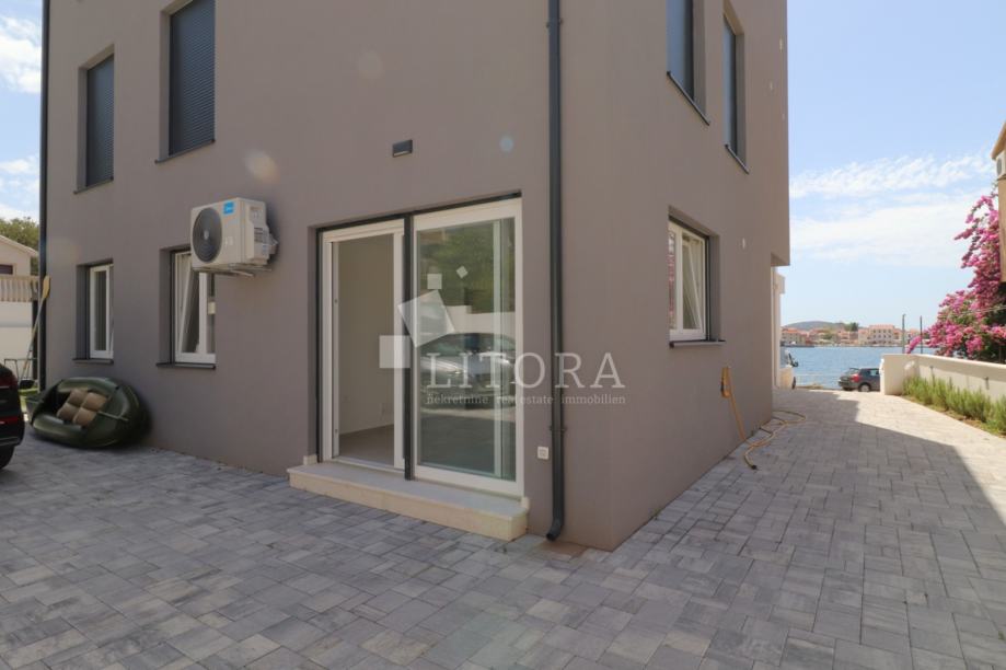 Apartman je odmah useljiv i opremljen dimnjakom, podnim grijanjem u kupaonici, električnim podizačima roleta, komarnicima, te termo fasadom. Dvorište je u potpunosti popločano i ograđeno, s otvorenim pogledom na more i otok Krapanj.