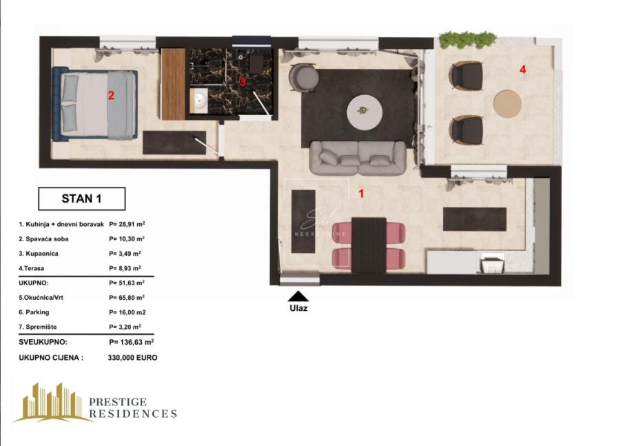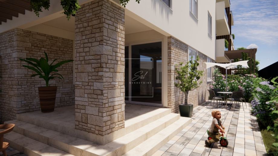 U ponudi je moderan i funkcionalan stan u prizemlju zgrade (R1-S1) sa terasom, vrtom i parkirnim mjestom što ga čini idealnim odabirom za ugodan obiteljski život.