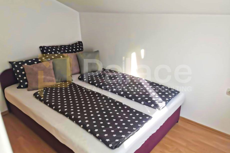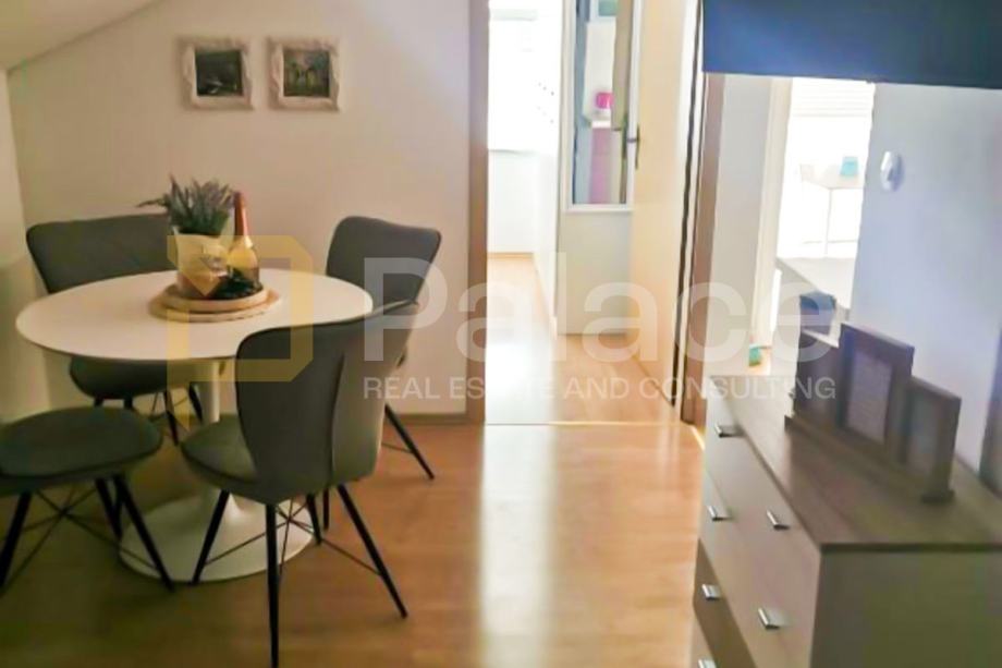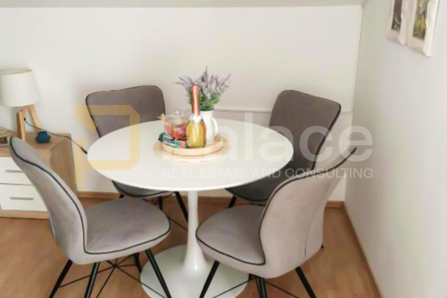 Ovaj stan smješten je u visokom potkrovlju, manje stambene zgrade, a sastoji se od kuhinje, blagovaonice, dnevnog boravka, jedne spavaće sobe, kupaonice s WC-om te lođe.