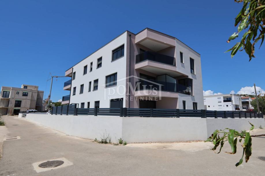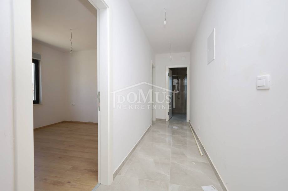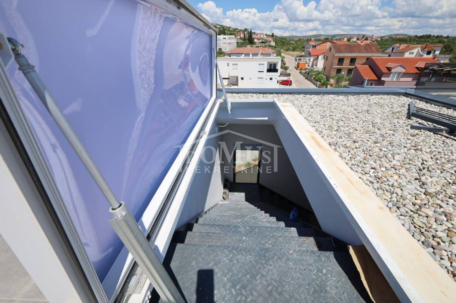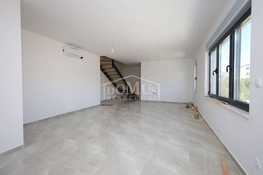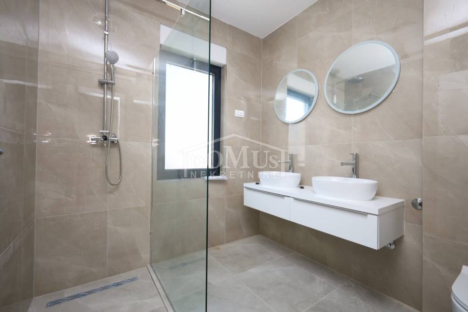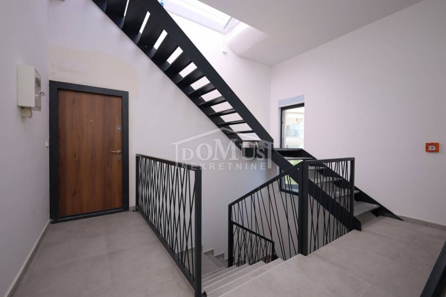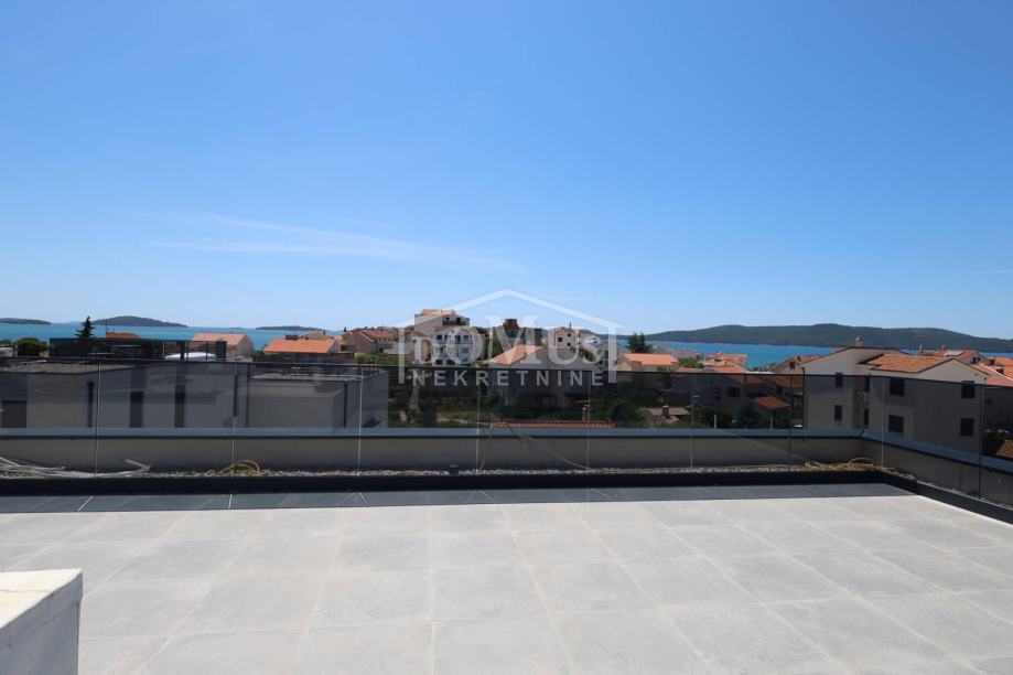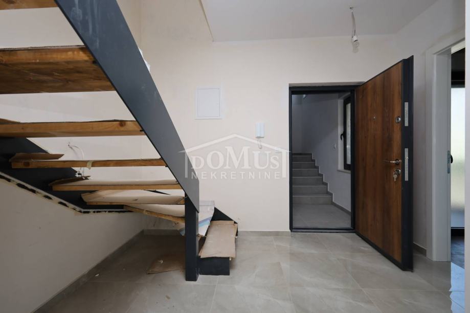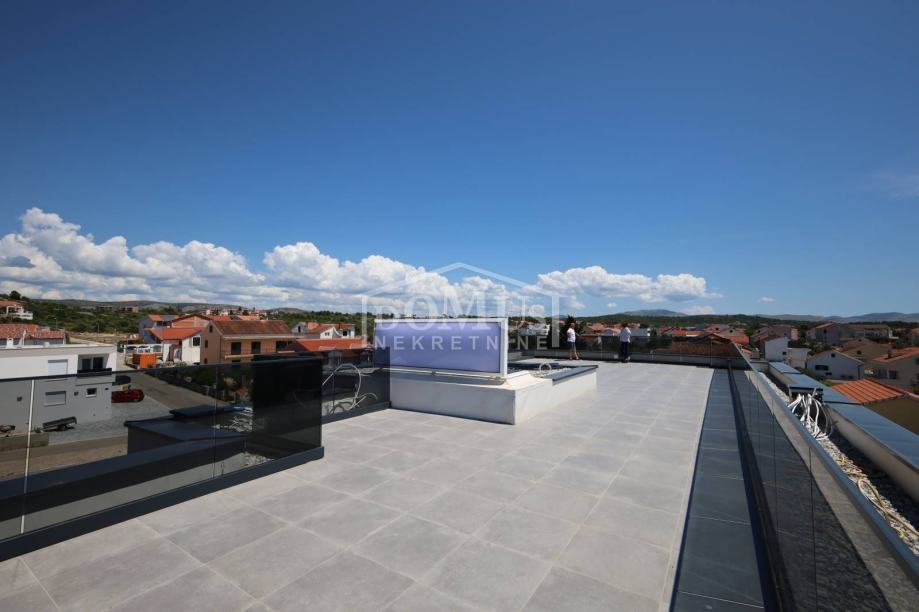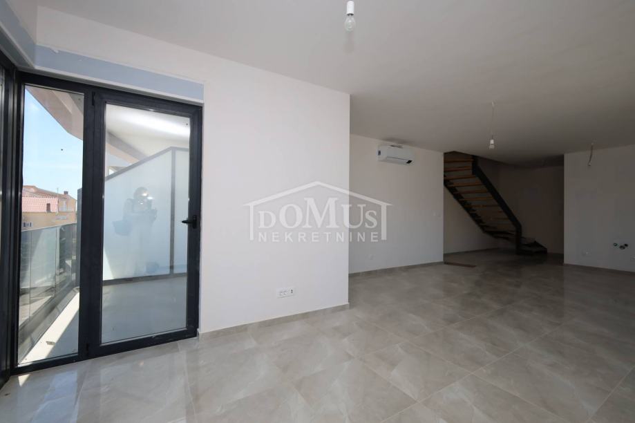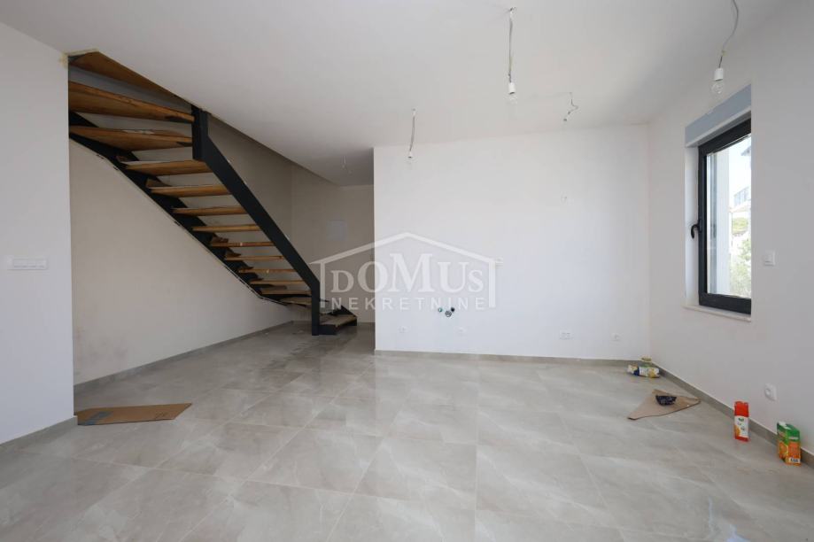 Novogradnja, dvoetažni stan S3 ukupne korisne površine od 159,59m2 smješten na 1. i 2. katu višestambene zgrade + krovna terasa s prekrasnim pogledom na more. Na 1. katu je smještena je prostrana kuhinja sa blagovaonom i dnevnim boravkom u cjelini, kupaona, dvije terase. Unutarnje stepenice vode na 2. kat gdje se nalazi soba sa garderobom i kupaonom i izlazom na terasu, dvije sobe, kupaona i hodnik. Stanu pripada i cijela krovna terasa površine 109,35m2 sa prekrasnim pogledom na more. Apartman je moderne arhitekture i funkcionalnog rasporeda, gdje su ugrađen vrhunski materijali keramike, sanitarija, alu stolarija sa elek. podizačima, komarnici, parket u sobama i podno grijanje u kupaoni. Stanu pripada i jedno garažmo parkirno mjesto površine 15,92m2. Do mora i plaže je udaljen 220m a do centra 800m.