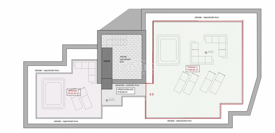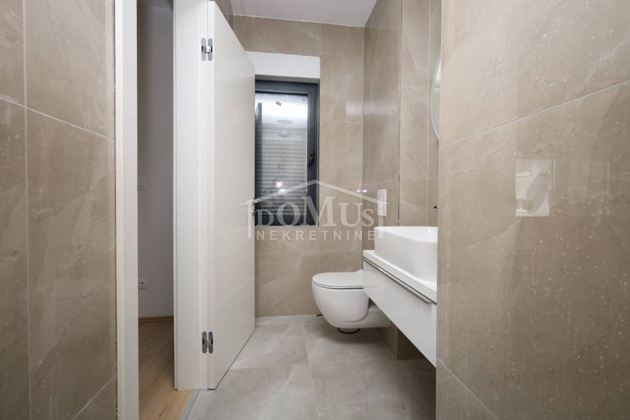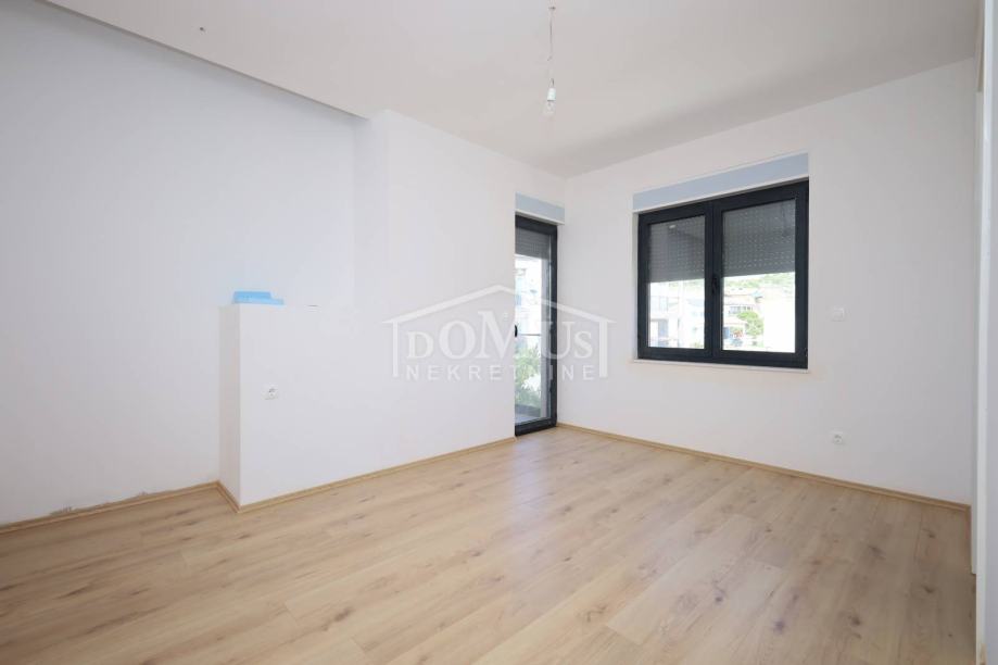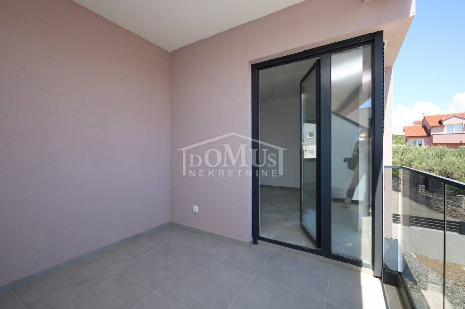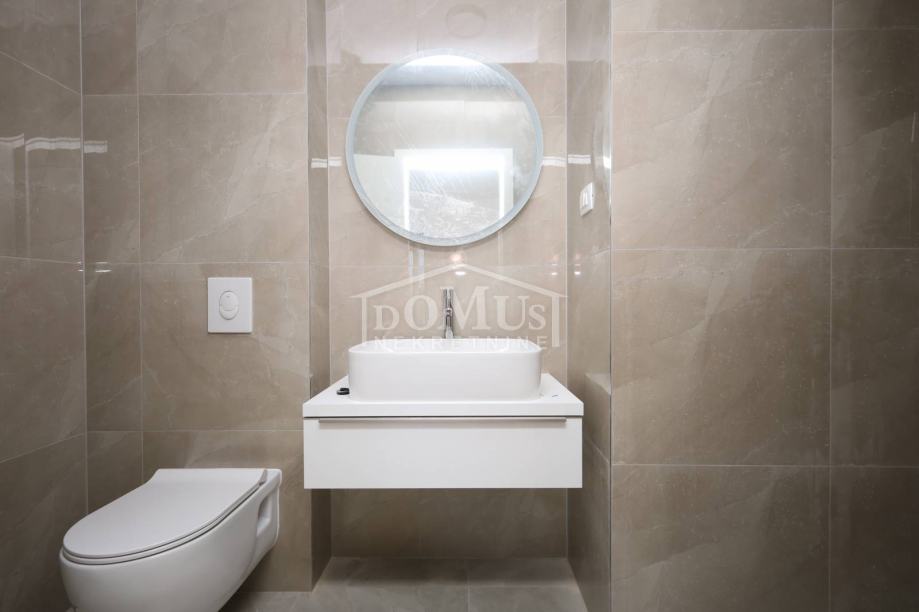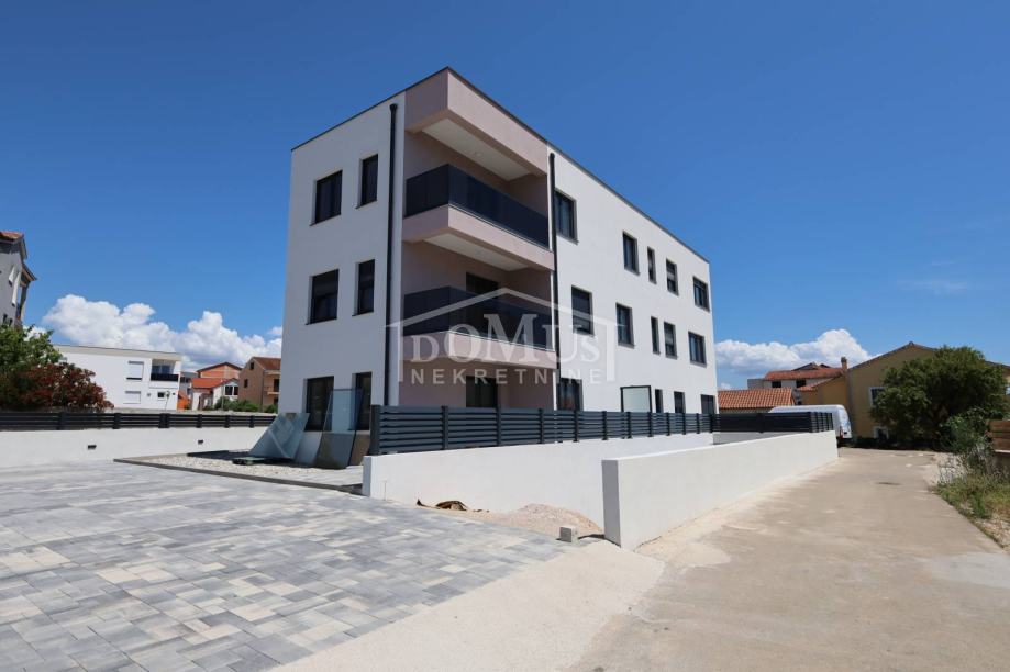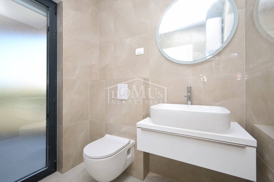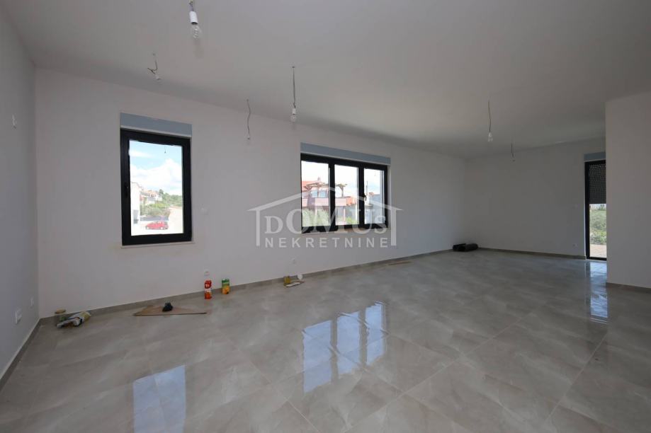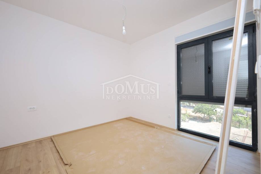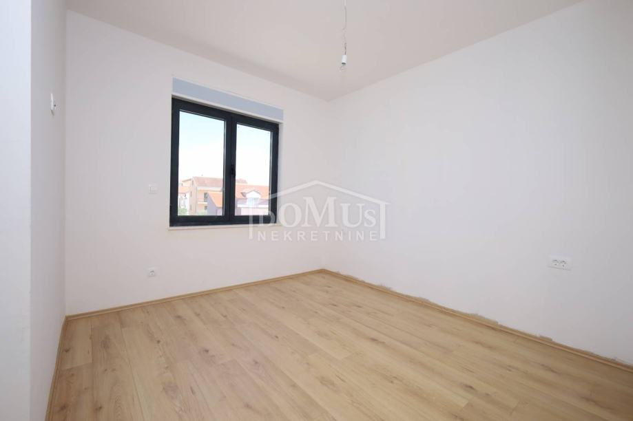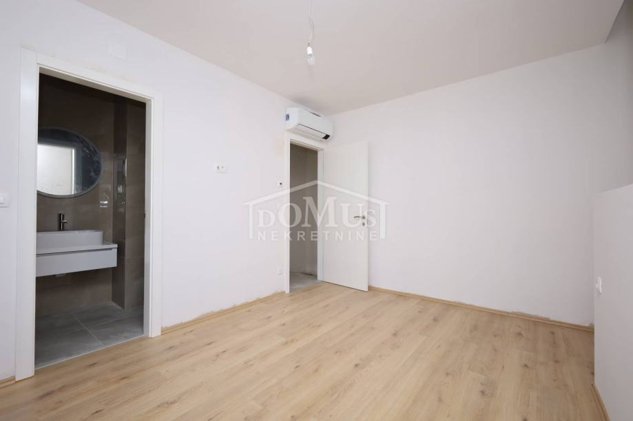 Novogradnja, dvoetažni stan S3 ukupne korisne površine od 159,59m2 smješten na 1. i 2. katu višestambene zgrade + krovna terasa s prekrasnim pogledom na more. Na 1. katu je smještena je prostrana kuhinja sa blagovaonom i dnevnim boravkom u cjelini, kupaona, dvije terase. Unutarnje stepenice vode na 2. kat gdje se nalazi soba sa garderobom i kupaonom i izlazom na terasu, dvije sobe, kupaona i hodnik. Stanu pripada i cijela krovna terasa površine 109,35m2 sa prekrasnim pogledom na more. Apartman je moderne arhitekture i funkcionalnog rasporeda, gdje su ugrađen vrhunski materijali keramike, sanitarija, alu stolarija sa elek. podizačima, komarnici, parket u sobama i podno grijanje u kupaoni. Stanu pripada i jedno garažmo parkirno mjesto površine 15,92m2. Do mora i plaže je udaljen 220m a do centra 800m.