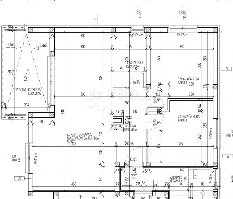 Dvosoban stan na 2 katu S3 neto stambene površine 64.15m² zatvoreni dio kojemu pripada natkrivena terasa od 9.72m² i 2 parkirna mjesta ukupne površine 25 m². Prodajna kvadratura stana u koeficijentima: 74.01 m².