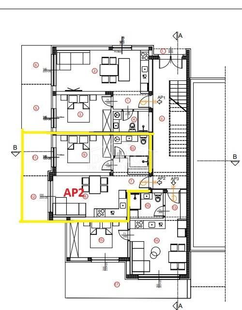Stambena jedinica AP2 nalazi se u prizemlju zgrade i ima ukupnu površinu 51,29 m². Stan se sastoji od hodnika, kuhinje, blagovaonice, dnevnog boravka, kupaonice i jedne spavaće sobe. Apartman ima terasu ukupne površine 13,28 m², djelomično natkrivenu i djelomično nenatkrivenu, s izravnim pristupom iz dnevnog boravka i spavaće sobe. Apartmanu pripada vrt površine 38 m² i dva parkirna mjesta.
