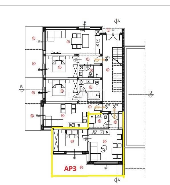 Stambena jedinica AP3 nalazi se u prizemlju z zgrade i ima ukupnu površinu 55,53 m². Stan se sastoji od hodnika, kuhinje, blagovaonice, dnevnog boravka, kupaonice i jedne spavaće sobe. Apartman ima terasu ukupne površine 17,5 m², djelomično natkrivenu i djelomično nenatkrivenu, s izravnim pristupom iz dnevnog boravka i spavaće sobe. Apartmanu pripada vrt površine 66 m² i dva parkirna mjesta.