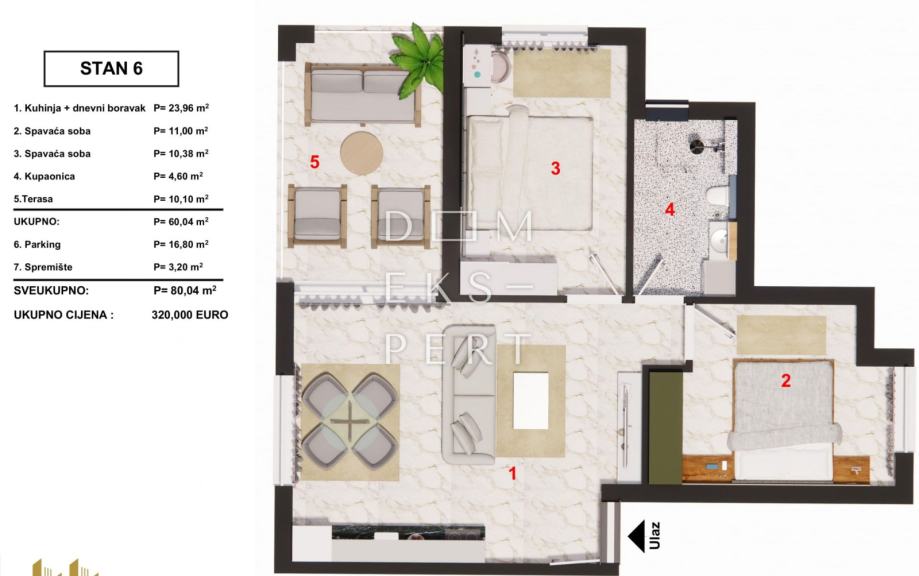 - ukupna površina stana s pripadcima 80.04 m² (terasa, parkirno mjesto, spremište)