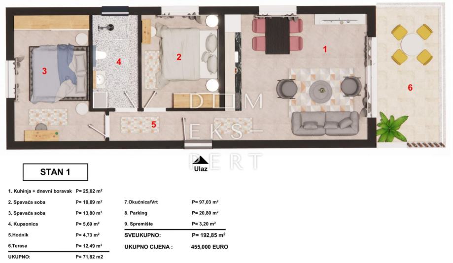 - ukupna površina stana s pripatcima 192.85 m² (vrt, parkirno mjesto, spremište)