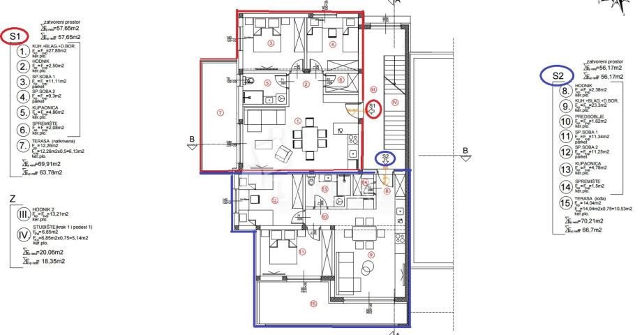Stan površine 66,70 m² sastoji se od hodnika, dvije spavaće sobe, predsoblje, kupaonice, spremišta, kuhinje s blagovaonicom i dnevnim boravkom koji ima izlaz na veliku terasu površine 14,04 m². Stanu pripadaju i dva parkirna mjesta ukupne površine 25 m².