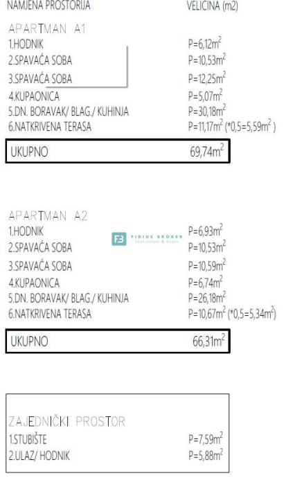 Apartman A2 ukupne korisne površine 78,31 m2 (stambena površina 66,31 m2 + dva parkinga 25 m2 + vrt 70 m2) nalazi se u prizemlju. Stan funkcionalnog rasporeda sastoji se od hodnika, kupaonice, dvije spavaće sobe, kuhinje s blagovaonicom, dnevnog boravka koji ima izlaz na natkrivenu terasu površine 10,67 m2 i lijepi vrt površine cca 70 m2. Stanu pripadaju dva parkirna mjesta. Cijena iznosi 241.061 €.