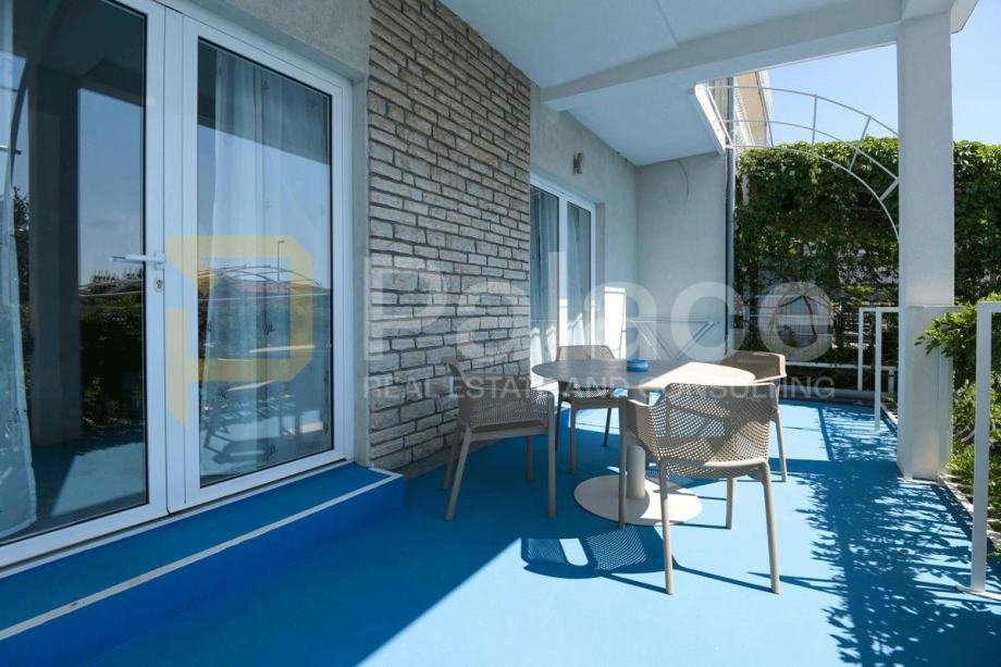 Stan se nalazi u prizemlju manje zgrade, pa mu pripada na korištenje prostrana terasa i dva vanjska parking mjesta, a sama stambena površina je 80m2.