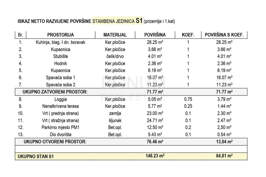 Prodaje se novi dvoetažan apartman s okućnicom i vrtom u Brodarici pored Šibenika. Apartman se sastoji od prizemlja i kata. Prizemlje se sastoji od ulaznog dijela, kupaonice, dnevnog boravka otvorenog tipa s kuhinjom i blagovaonicom iz kojeg e izlazi na lođu povezanu nenatkrivenom terasom i vrtom s prednje strane 23 m2. Dnevni dio je povezan s još jednim vrtom 24,71 m2 koji se nalazi sa stražnje strane.