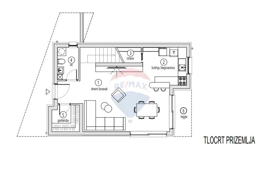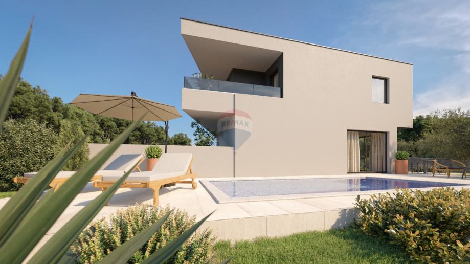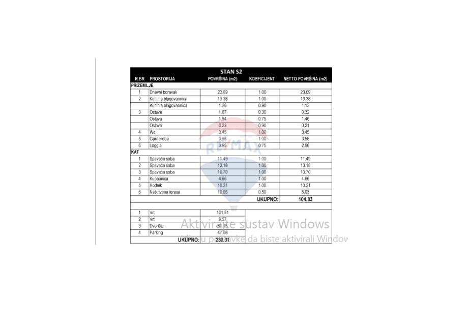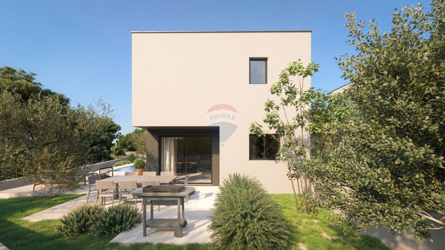 U prizemlju je smještena kuhinja s blagavaonicom (14,64 m2), wc (3,45 m2), garderoba (3,56 m2), dnevni boravak (23,09 m2) iz kojeg se izlazi na prostranu terasu koju okružuje lijepo uređen vrt (101,51 m2) u kojem je smješten i prostrani bazen.