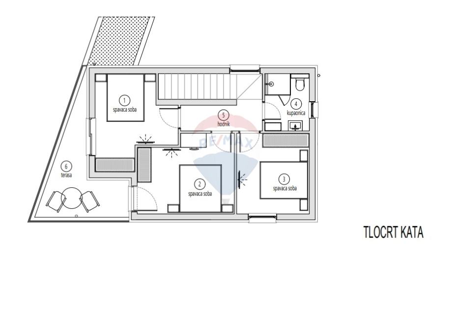 Unutarnjim stepeništem se dolazi na kat na kojem se nalaze tri spavaće sobe (11,49 m2, 13,18 m2, 10,70 m2) i kupaonica sa wc-om(4,66 m2). Dvije spavaće sobe imaju izlaz na natkrivenu terasu (10,06 m2) koja ima pogled na more.