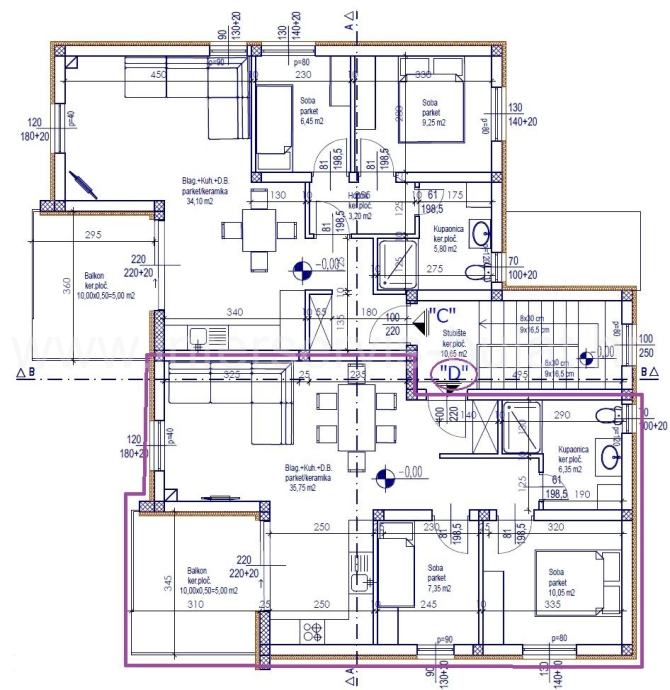 Stan D na 1. katu površine 73m2 sastoji se od kuhinje-blagovaonice-dnevne, predsoblja, kupaonice, 2 spavaće sobe, terase 10m2 i pripadajućeg parkirnog mjesta.
