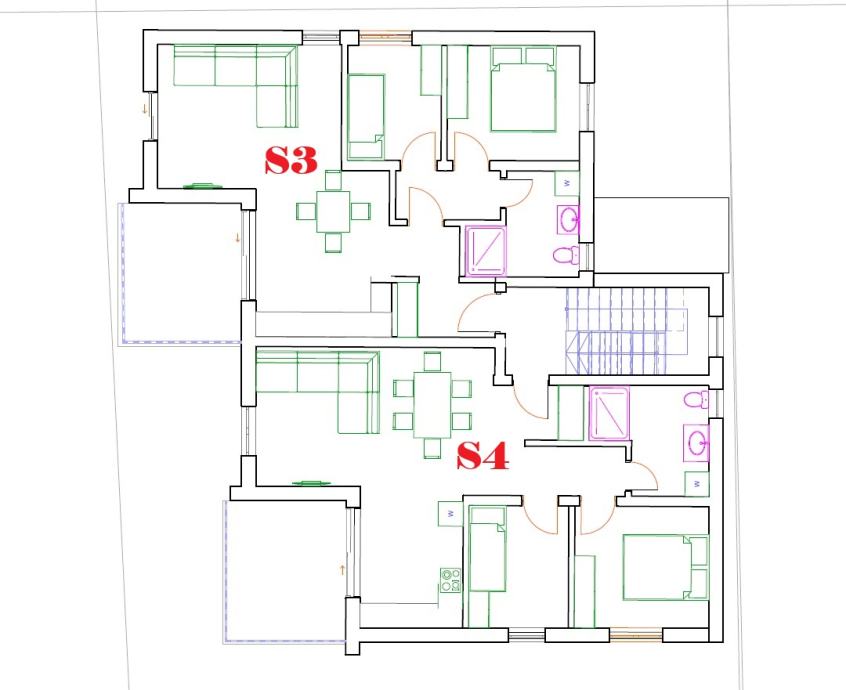 STAN S4 nalazi se na prvom katu, ima 67,00m2 neto korisne površine s uračunatim koeficijentima, te se sastoji od: ulazni prostor, dnevni boravak, kuhinja i blagovaonica, natkrivena terasa, hodnik, 2 spavaće sobe, kupaonica, te 1 parking mjesto