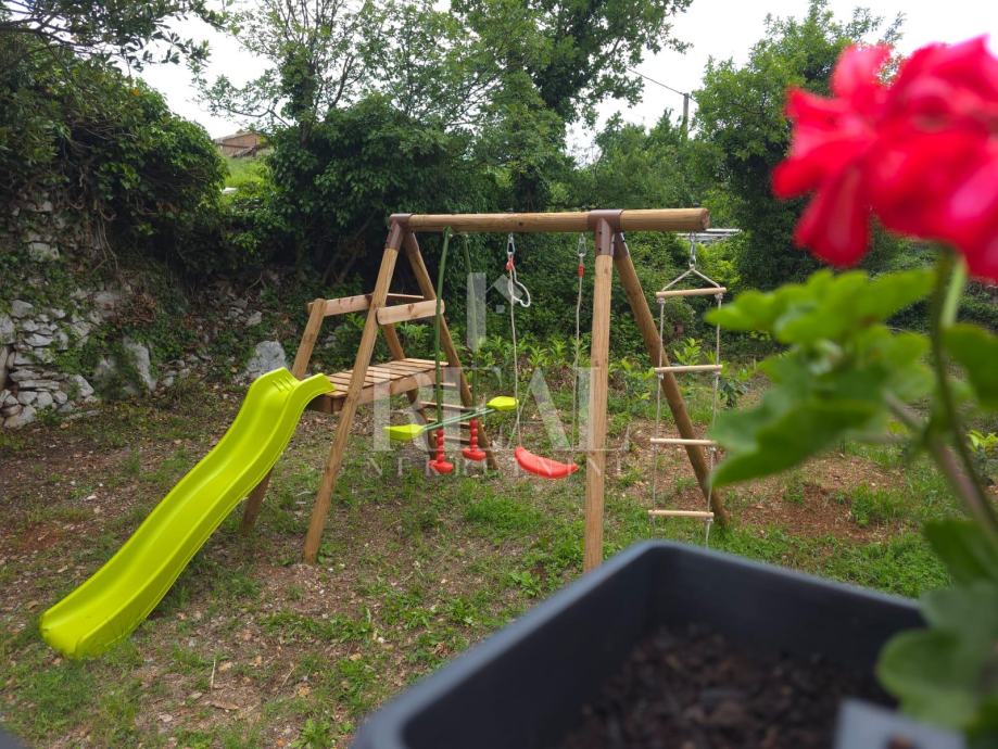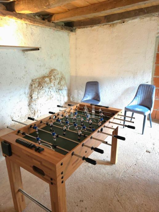 Okućnica je kompletno uređena i nudi brojne sadržaje: privatni parking, dječje igralište, zonu za roštilj te popločani prilaz. Pristup kući je asfaltiran.