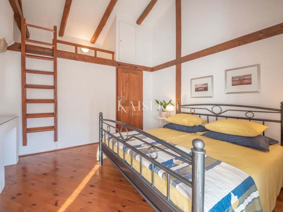 Na katu su dvije spavaće sobe (jedna 16 m², druga nešto manja), svaka s klima uređajem, te kupaonica. Iz jedne sobe pruža se izlaz na terasu s pogledom na bazen i okolnu prirodu.