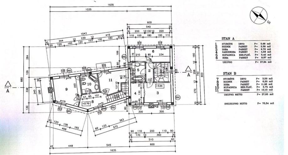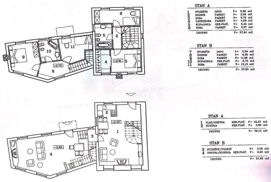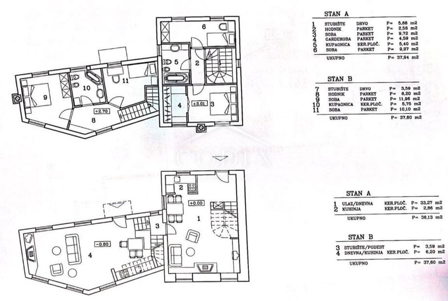 Ova nekretnina sastoji se od dva dvoetažna stana, svaki s vlastitim ulazom i orijentacijom na suprotnu stranu, pružajući privatnost i mir za buduće stanare.