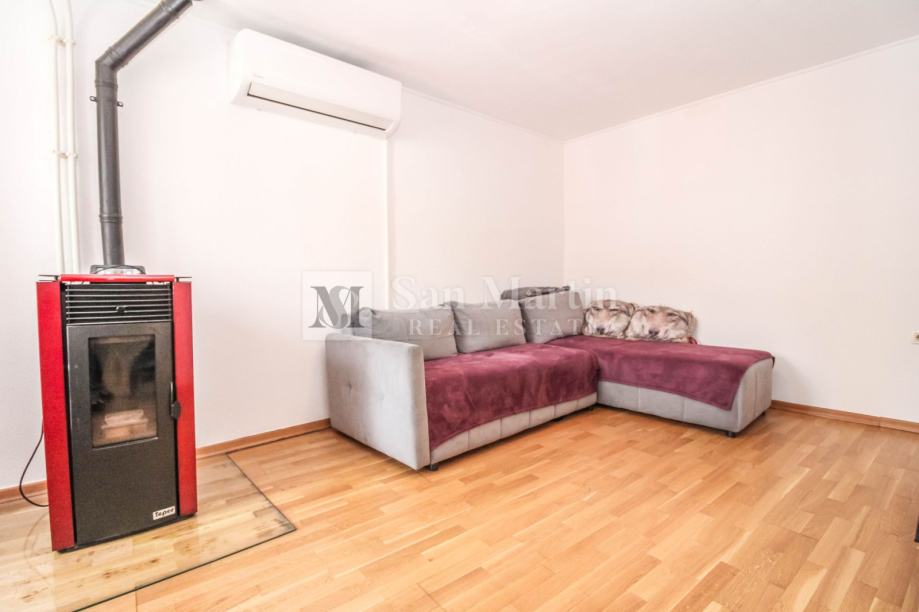 Stan se nalazi u tradicionalnoj manjoj zgradi u centru mjesta ne 2. katu.Stan se sastoji od kuhinje sa blagovaonicom, dnevnog boravka, 1 spavaće sobe na jednoj etaži, a na 1. se nalaze druga spvaća soba, renoviranog kupatila, stubišta i hodnika te potkrovlja. Stan se grije pomoću centralnog grijanja na peći na pelete i klima uređaja.