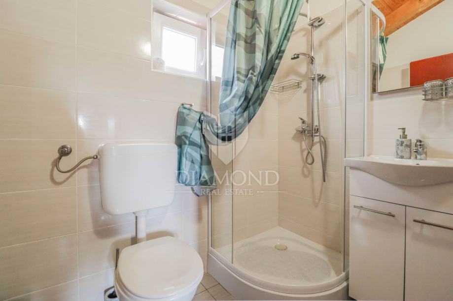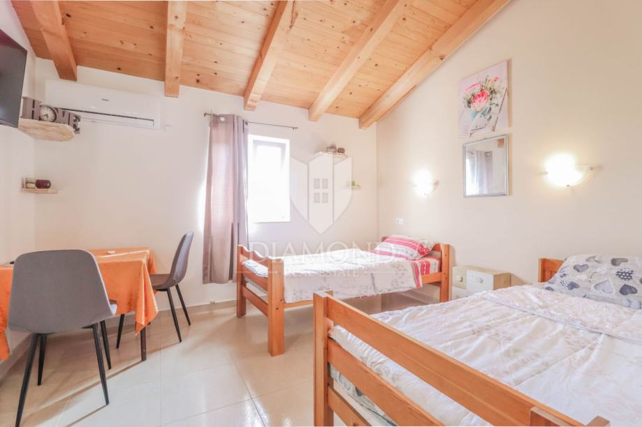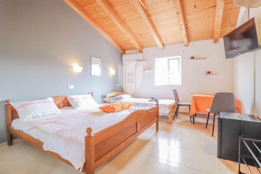 Ukupna površina kuće iznosi 508m2. Kuća je koncipirana kao dva odvojena dijela. Prvi dio kuće se sastoji od poslovnog prostora s natkrivenom terasom i izlazom na dvorište, ukupne površine od 275 m2. Poslovni prostor je trenutačno u funkciji konobe. Uz poslovni prostor u prizemlju se nalazi još jedan manji apartman koji se sastoji se sastoji od kuhinje s blagovaonicom, jedne spavaće sobe i kupaonice. Na katu se nalaze tri spavaće sobe s kupaonicom ukupne kvadrature 74 m2 koje se mogu turistički iznajmljivati. Drugi dio kuće se sastoji od dva stana svaki sa svojim odvojenim ulazom. Prvi stan se nalazi na prvom katu i sastoji od kuhinje s blagovaonicom, dnevnog boravka, tri spavaće sobe i kupaonicom. Drugi stan je iste površine u roh-bau fazi (samo zidovi) i potrebna mu je adaptacija.