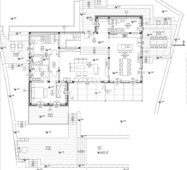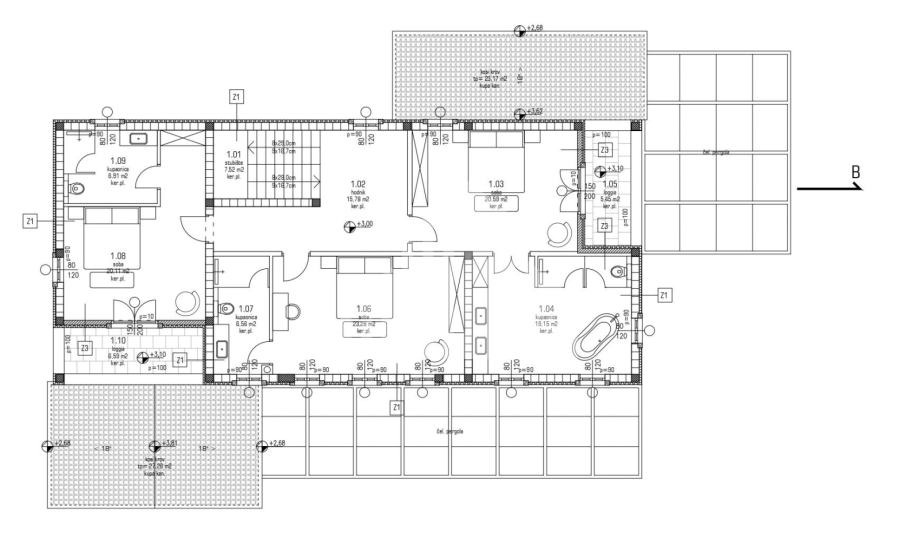 U prizemlju vile nalazi se dnevni dio u otvorenom konceptu koji obuhvaća modernu kuhinju, blagovaonicu i dnevni boravak te prostranu ostavu i toalet. Jedna spavaća soba s pripadajućom kupaonicom također se nalazi u prizemlju, kao i wellness prostor s hidromasažnom kadom, saunom i tušem. Iz wellness prostora izlazi se na terasu s vanjskom blagovaonicom, dok dnevni dio i spavaća soba imaju izlaz na drugu terasu s ljetnom kuhinjom i prostorom za druženje.